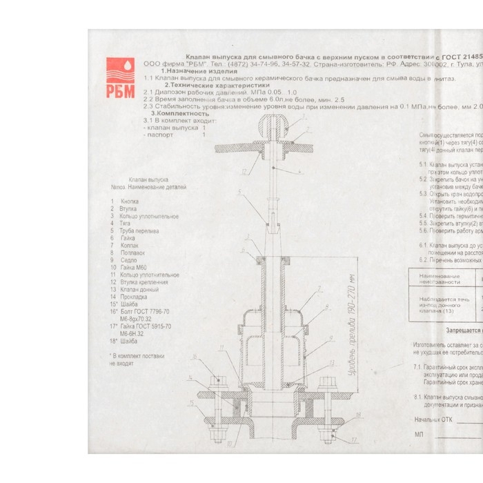 Клапан сливной для бачка унитаза "РБМ" КВ-1.1