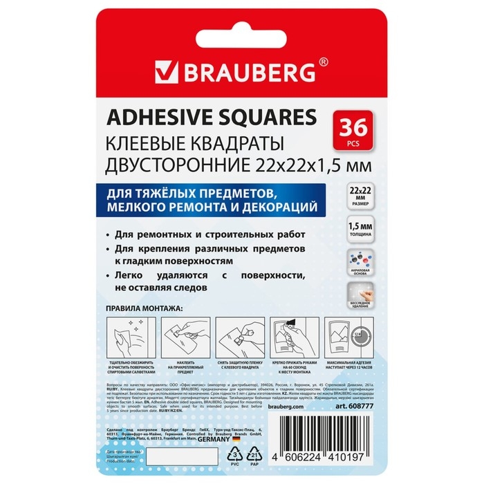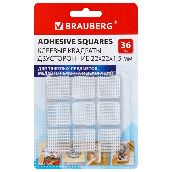 Клеевые квадраты двусторонние, 22 мм х 22 мм, акриловая основа, 36 шт., BRAUBERG