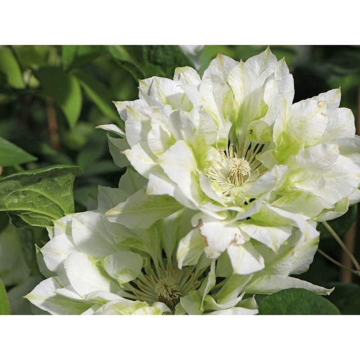 Цветы всегда махровые, состоящие из 30–50 в разные стороны перекрученных, свободно собранных, белых чашелистиков с зелёной полоской и основанием со время первого цветения. У тычинок жёлтые пыльники на лимонных нитках, диаметр 14см. Цветение с мая по июнь на прошлогодних побегах, затем с августа по сентябрь на побегах текущего года. Высота 2,5 м. 2-я группа обрезки (до середины). Не любит солнечных, горячих мест. Как и все клематисы очень любит мульчирование: сосновая или лиственная кора, хвойный опад, щепа и тд. Рекомендуется делать приствольный круг бордюрной лентой для задержания влаги и мульчирующего материала. На зиму желательна окучка.