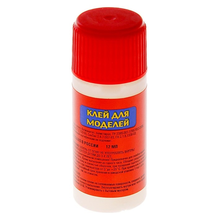 Универсальный клей, без которого не обойтись при сборке классической пластиковой модели. Его основные компоненты — бутилацетат и полистирол. Они растворяют поверхность пластика, что позволяет соединить две части и «сварить» их между собой. Клей не имеет резкого запаха, не оставляет подтёков, исключает возможность отпадания деталей.