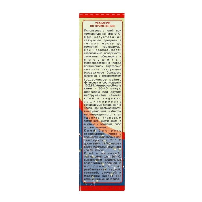 Клей эпоксидный ЭДП-2 предназначен для склеивания металлов, дерева, керамики, фарфора, камня, стеклопластика и др. материалов в любом сочетании, а также заполнения трещин, раковин, отверстий, наращивания сколов, окантовки и обрамления. Может использоваться для склеивания зеркал, стекол и других изделий из стекла, ремонта и изготовления наливных полов, ювелирных изделий, бижутерии и сувениров, для нанесения объемных покрытий (линз) на пластику, декупаж, серьги, кулоны, кольца, значки, магнитики и др., заливки отдельных элементов и композиций в формы.