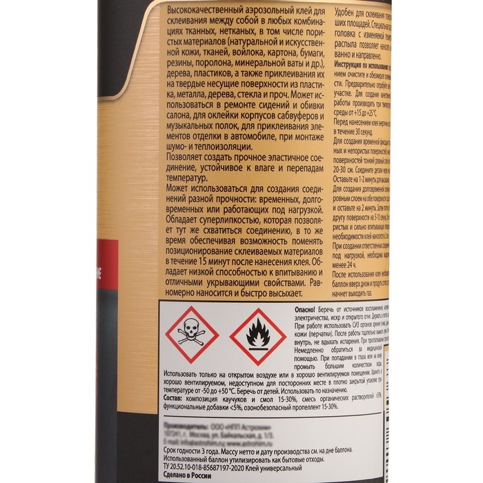 ASTROhim Клей-спрей - высококачественный аэрозольный клей для склеивания между собой в любых комбинациях тканных, нетканых, в том числе пористых материалов (натуральной и искусственной кожи, тканей, войлока, картона, бумаги, резины, поролона, минеральной ваты и др.), дерева, пластиков, а также приклеивания их на твердые несущие поверхности из пластика, металла, дерева, стекла и проч. Может использоваться в ремонте сидений и обивки салона, для оклейки корпусов сабвуферов и музыкальных полок, для приклеивания элементов отделки в автомобиле, при монтаже шумо- и теплоизоляции.