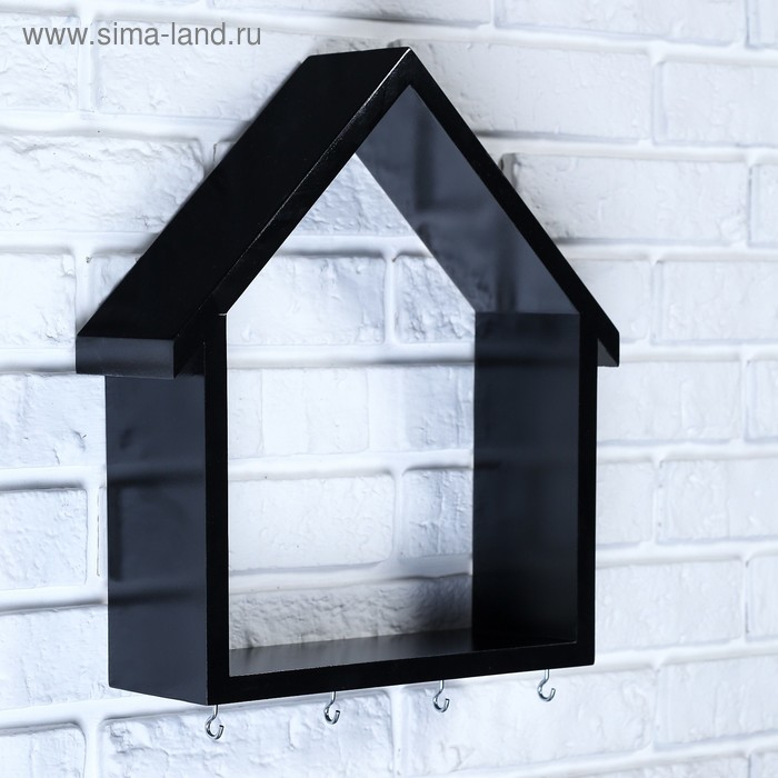 Ключница-полка Домик большая, 4 крючка, черная 36*33*10