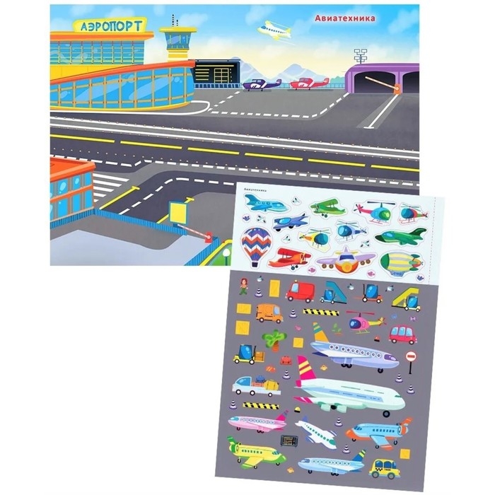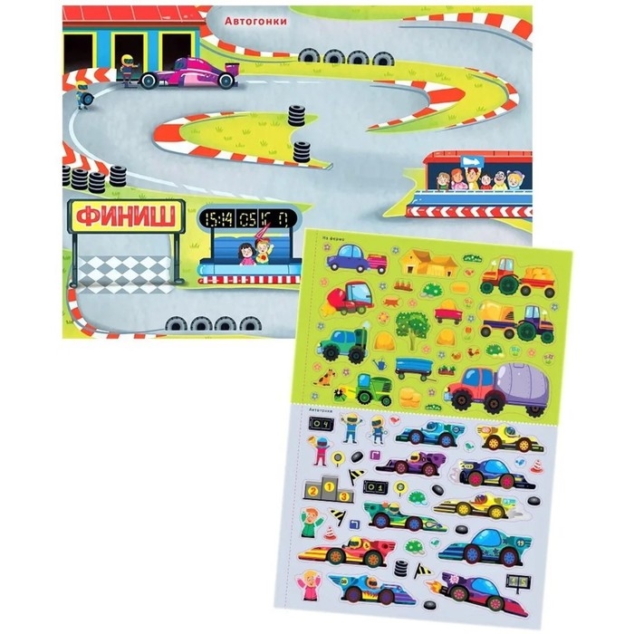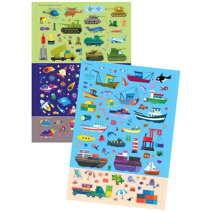 Более 600 ярких наклеек, которые помогут ребёнку создавать собственные картины и познакомят ребёнка с разными видами транспорта и другой техники.