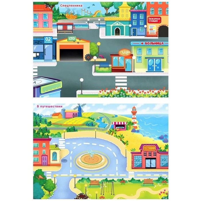 - 12 тематических фонов в музее, транспорт в городе, техника на стройке, спецтехника, в космосе и др.
