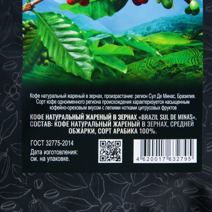 Кофе натуральный жареный в зернах, произрастание: регион Сул Де Минас, Бразилия. Сорт кофе одноименного региона происхождения характеризуется насыщенным кофейно-ореховым вкусом с легкими нотками цитрусовых фруктов.