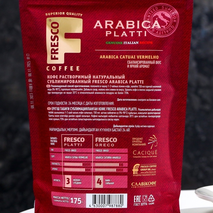 Сбалансированный вкус и яркий аромат. Кофе Fresco Arabica Platti создан в честь легендарного кафе Platti, что находится в Турине. Все здесь — от пирожных и шоколадных конфет до аперитивов и кофе — готовится по старинным, бережно сохраняемым рецептам, которые с течением времени впитали в себя весь колорит итальянской жизни — безмятежной и импульсивной, традиционной и новаторской. С первого глотка кофе Fresco Arabica Platti вас окутает вдохновляющий аромат и откроются грани яркого, насыщенного вкуса с теплыми нотками шоколада. Это настоящий шедевр кофейного искусства прикоснуться к которому захочется вновь и вновь.