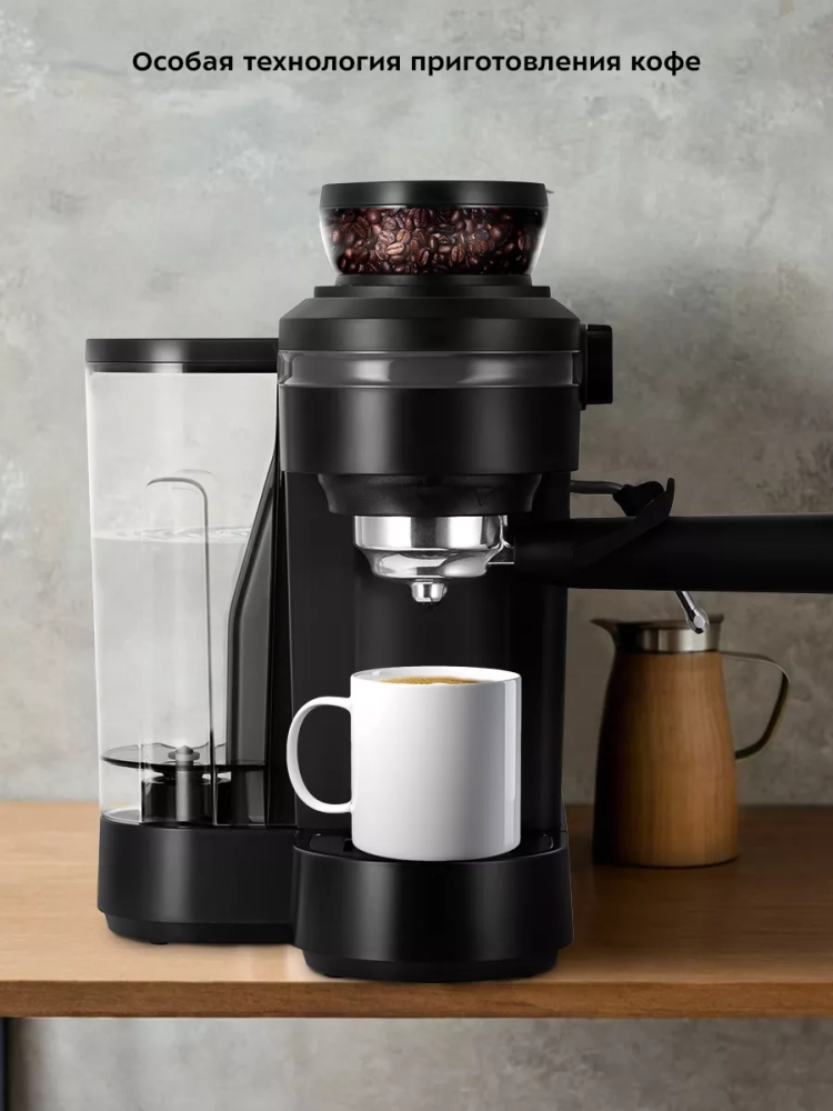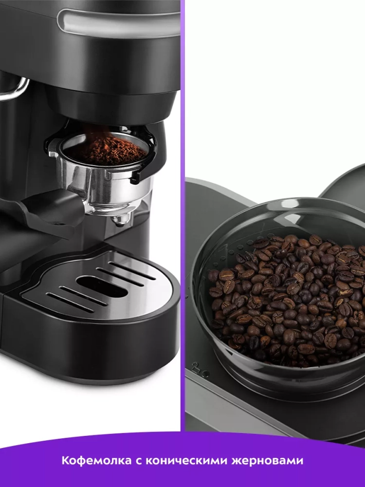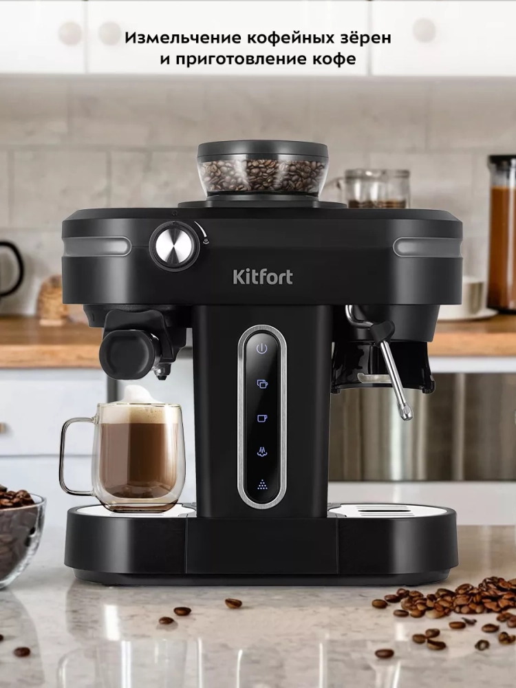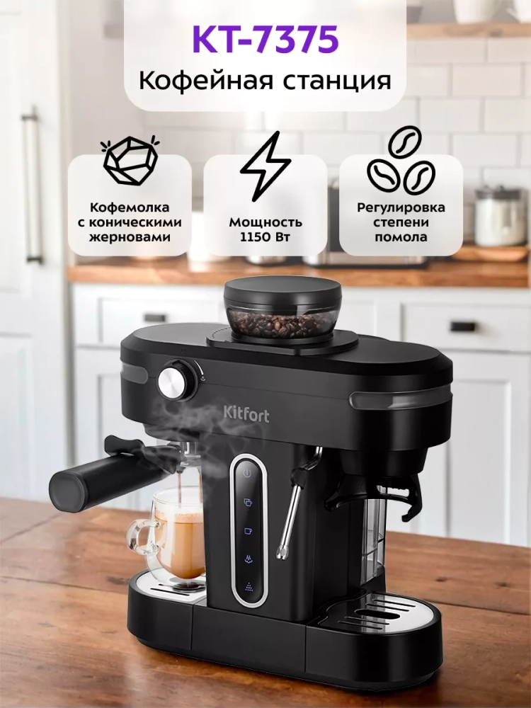 Кофейная станция Kitfort КТ-7375 сочетает в себе два устройства в одном корпусе. Встроенная кофемолка с коническими металлическими жерновами позволяет измельчать кофейные зерна непосредственно перед приготовлением кофе, что положительно отражается на вкусе готового напитка. Кофейная станция поможет приготовить кофе эспрессо, капучино или латте, а также множество других видов кофе на ваш вкус. С помощью стимера вы можете приготовить молочную пенку, а также подогреть паром остывший чай или другие напитки.
