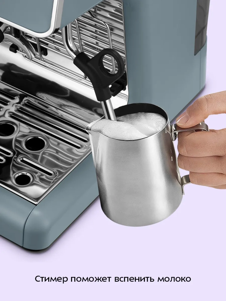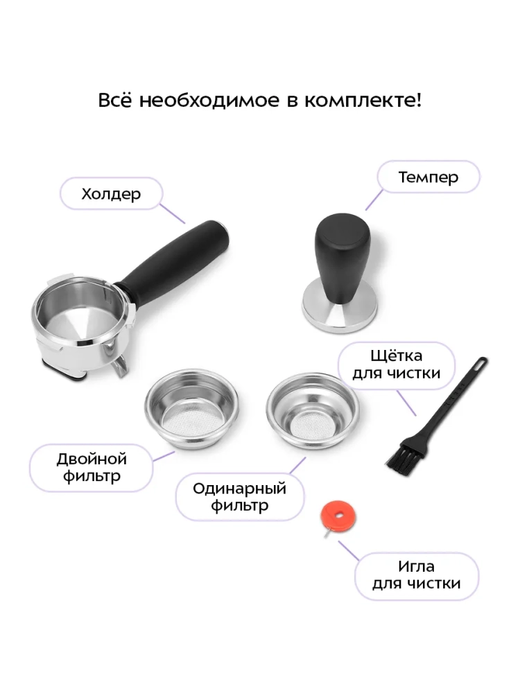 Металлический рожок хорошо прогревает напиток, и кофе получается насыщенным, густым и с хорошей пенкой. Металлические фильтры с лазерным нанесением отверстий долговечны, и они не требуют использования каких-либо расходующихся частей. Темпер поможет утрамбовать в фильтре кофейную таблетку.