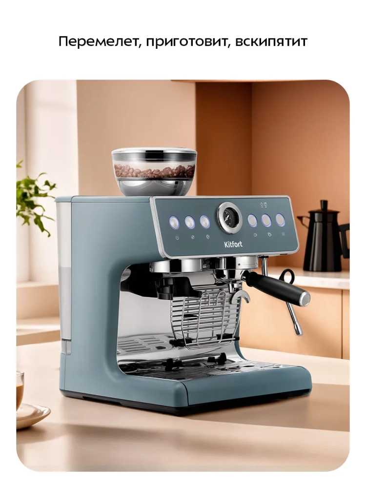 Кофейная станция Kitfort КТ-7521 сочетает в себе два устройства в одном корпусе. Встроенная кофемолка с коническими металлическими жерновами позволяет измельчать кофейные зерна непосредственно перед приготовлением кофе, что положительно отражается на вкусе готового напитка. Кофейная станция поможет приготовить эспрессо, американо, капучино или латте, а также множество других видов кофе на ваш вкус. С помощью стимера вы можете приготовить молочную пенку, а также подогреть паром остывший чай или другие напитки.