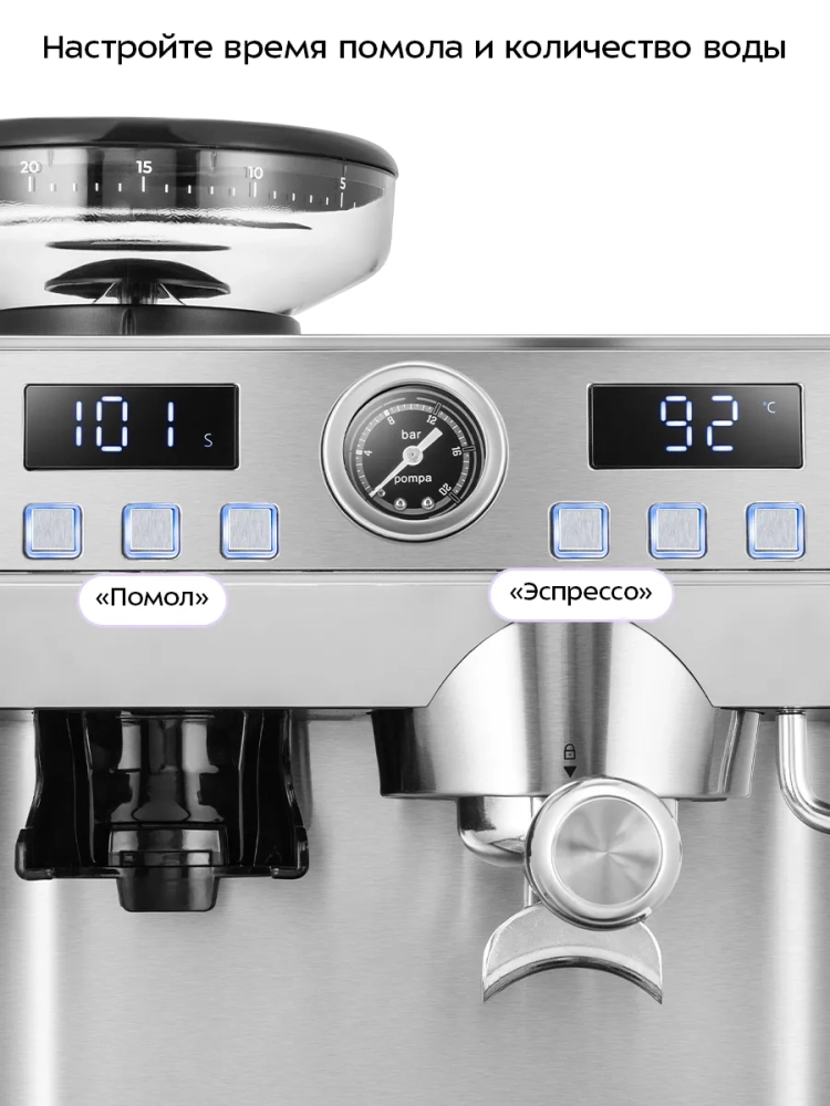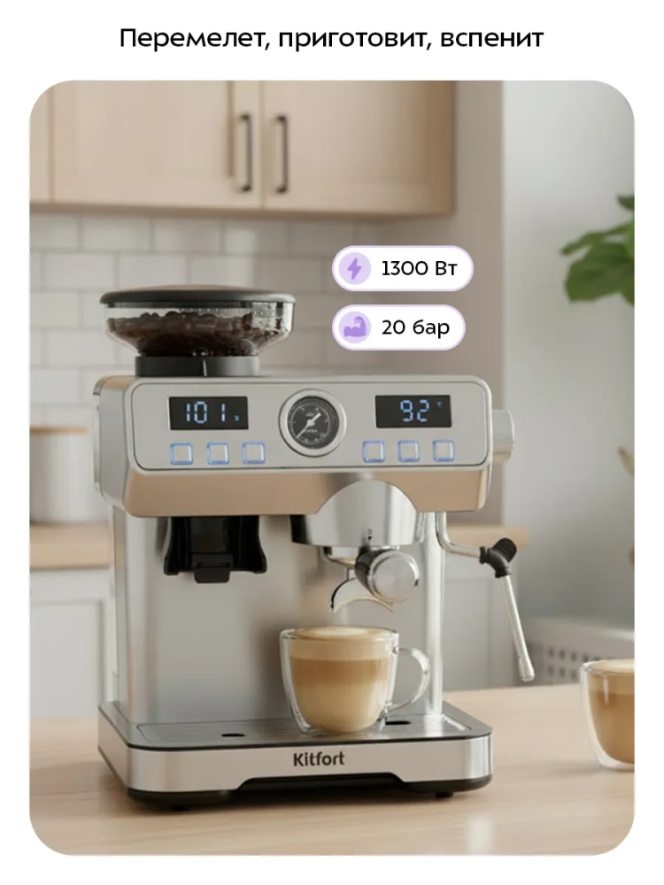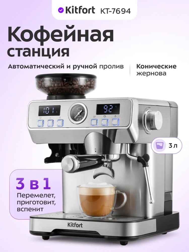 Кофейная станция Kitfort КТ-7694 сочетает в себе два устройства в одном корпусе. Встроенная кофемолка с коническими жерновами из нержавеющей стали позволяет измельчать кофейные зерна непосредственно перед приготовлением кофе, что положительно отражается на вкусе готового напитка. С помощью стимера вы можете приготовить молочную пенку, а также подогреть паром остывший чай или другие напитки. Также можно включить подачу горячей воды через стимер. Кофейная станция поможет приготовить эспрессо, а также множество других видов кофе на ваш вкус.