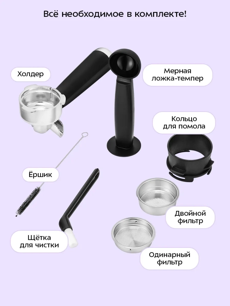 Металлический рожок хорошо прогревает напиток, и кофе получается насыщенным, густым и с хорошей пенкой. В комплекте предусмотрено 2 фильтра: для одной порции эспрессо и для двойного эспрессо.