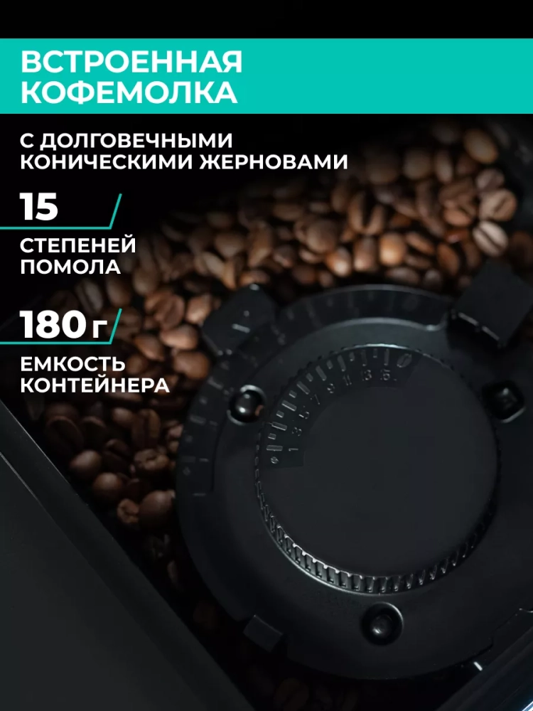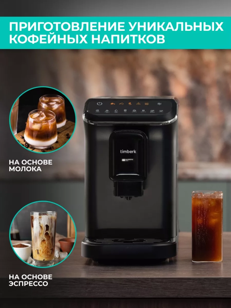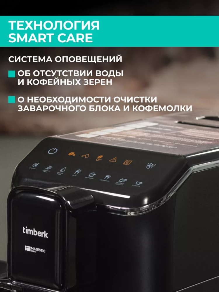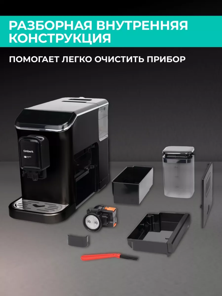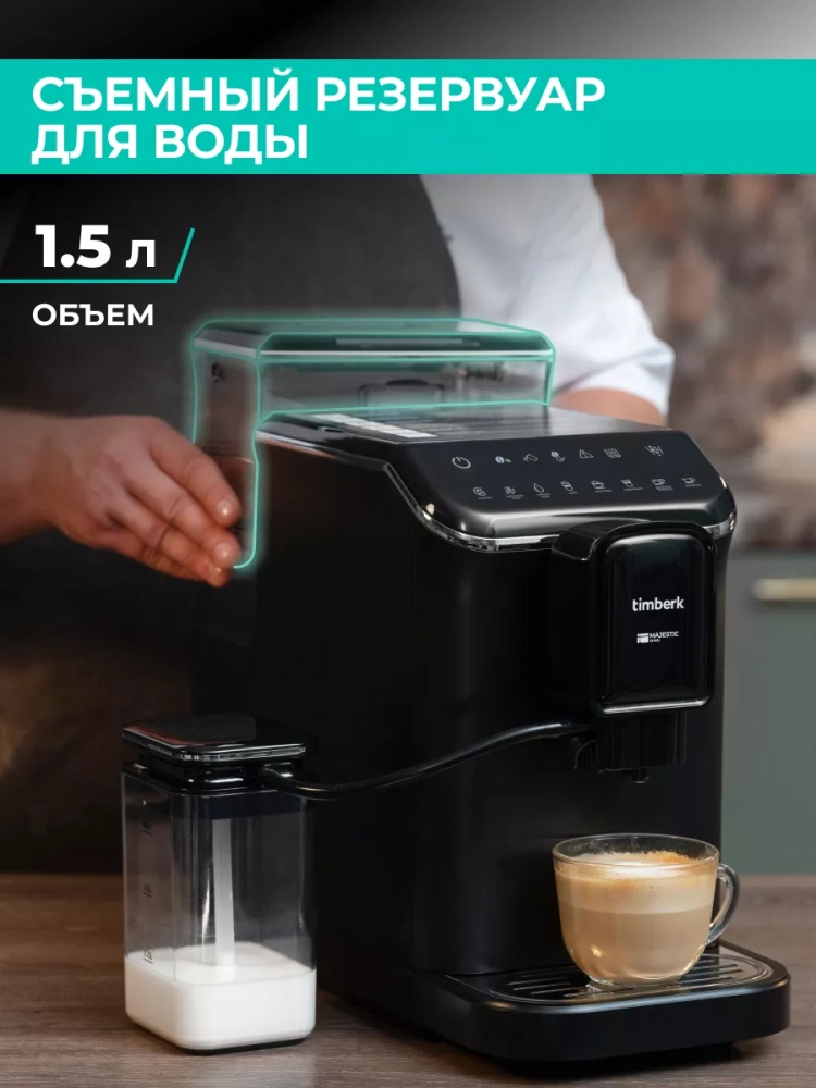 Бодрящий кофейный напиток всего за одну минуту с кофемашинами Timberk! Прибором предусмотрено широкое меню напитков, среди них: американо, капучино, латте, эспрессо, двойной эспрессо, горячая вода. Итальянская помпа давлением 20 Бар обеспечивает максимальную экстракцию и насыщенный вкус. Для приготовления напитков с добавлением молока предусмотрен капучинатор, который за считанные секунды преобразует молоко в густую и ароматную пенку. Правильную эксплуатацию прибора поможет обеспечить технология SMART CARE, настроенная на оповещение пользователя об ошибках. Регулировка вкуса и крепости напитка осуществляется с помощью встроенной кофемолки, оснащенной коническими жерновами и 15 степенями помола. Прибор легко очищать, как автоматически, так и механически. Для автоматической очистки предусмотрены программы на главном экране, а механическую очистку легко осуществить благодаря разборной внутренней конструкции.