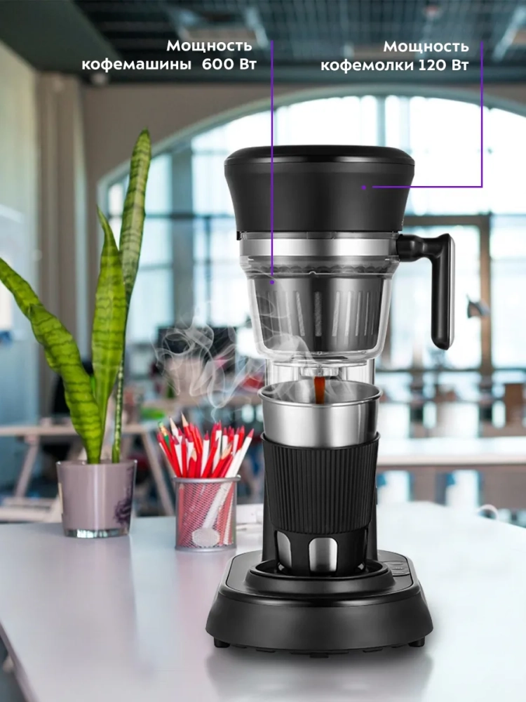 В капельной кофеварке вода доводится до температуры 80–90 *С, после чего медленно поступает в фильтр с молотым кофе. Пройдя через него, она попадает в стакан, который сохранит тепло вашего кофе. Стакан выполнен из нержавеющей стали с пластиковой вставкой, которая не дает вам обжечься или выронить из рук стакан. А крышка стакана позволяет пить кофе на ходу благодаря удобной форме отверстия для питья. Сетка фильтра кофемашины изготовлена из нержавеющей стали, что значительно продлевает срок службы.