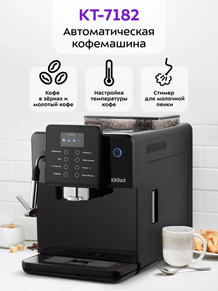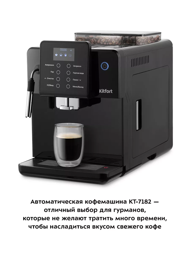 Автоматическая кофемашина Kitfort КТ-7182 — отличный выбор для гурманов, которые не желают тратить много времени и сил, чтобы насладиться полным букетом вкуса свежего кофе. Особая технология приготовления позволяет сохранить большое количество полезных веществ и тонкий аромат напитка. Кофемашина поможет приготовить кофе эспрессо, американо, капучино или латте, а также множество других видов кофе на ваш вкус. С помощью кофемашины также можно подогреть сок, остывший чай и другие напитки.