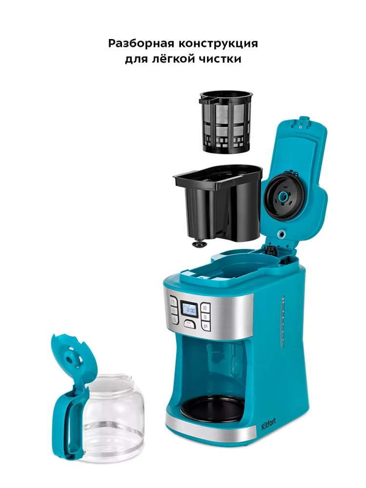 Капельная кофемашина Kitfort КТ-7237 готовит ароматный кофе из молотого кофе или из кофейных зерен. Встроенная роторная кофемолка автоматически измельчит кофейные зерна сразу в фильтре.