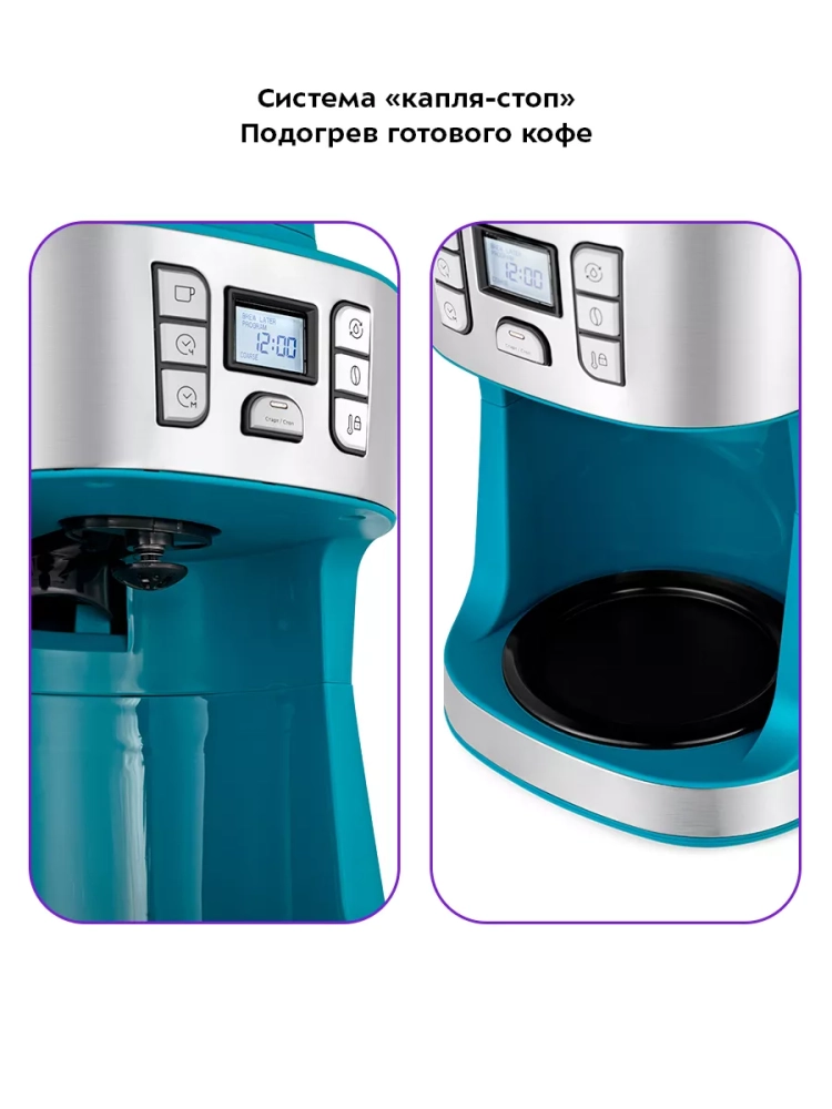 Воронка кофемашины оборудована противокапельной системой — затвором, приостанавливающим подачу кофе при вынимании кофейника из кофемашины. Вы можете налить кофе в чашку, не дожидаясь окончания приготовления.