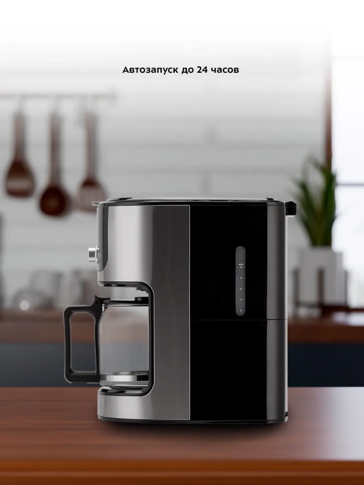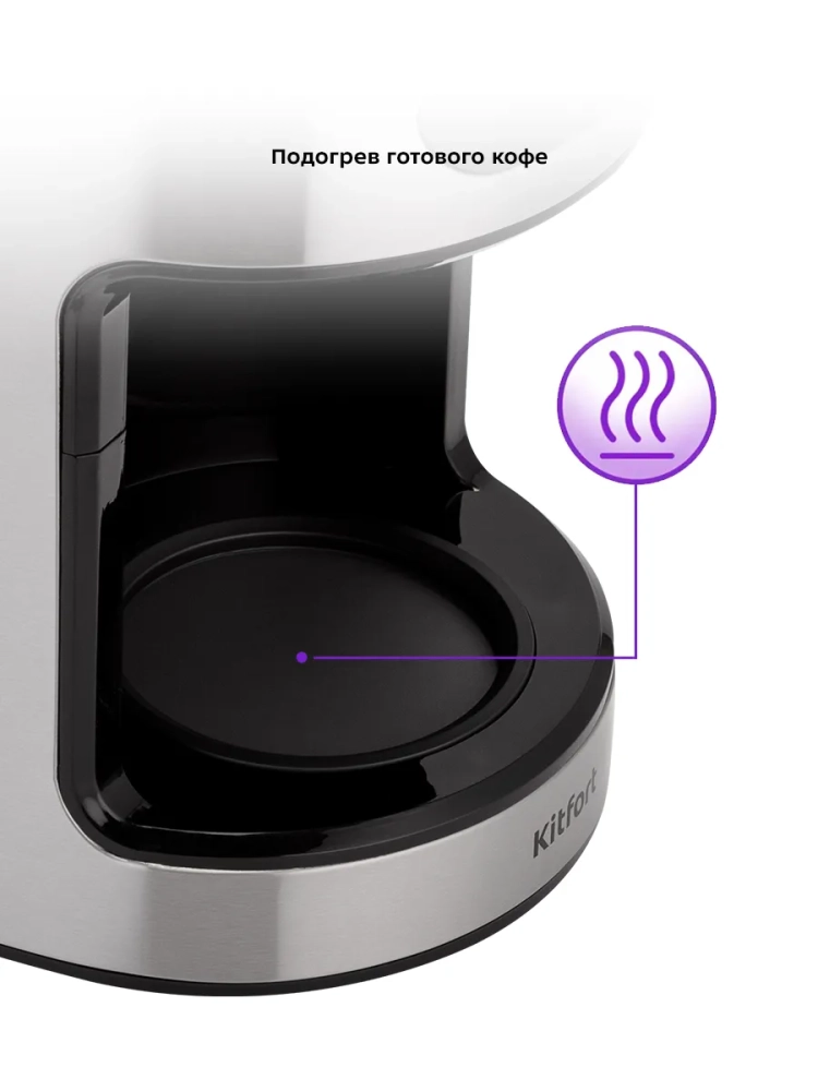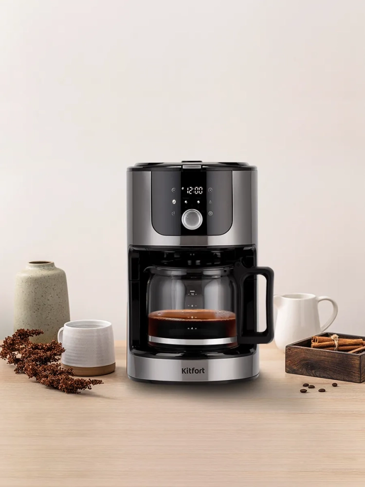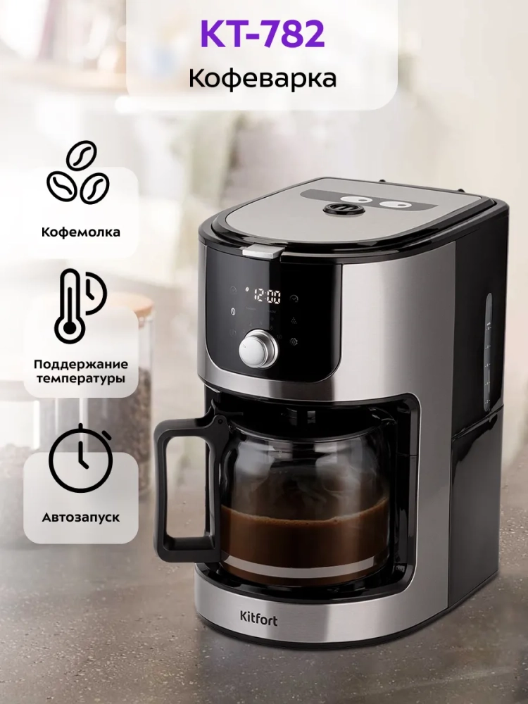 Капельная кофемашина Kitfort КТ-782 готовит ароматный кофе одним нажатием кнопки. Встроенная кофемолка автоматически измельчит кофейные зерна сразу в фильтре. В капельной кофемашине вода доводится до температуры 80–90 *С, после чего медленно поступает в фильтр с молотым кофе. Пройдя через него, она попадает в кофейник. По окончании приготовления напитка кофемашина перейдет в режим подогрева. Платформа с подогревом, на которой стоит кофейник с готовым кофе, будет горячей в течение 30 минут, затем кофемашина выключится. Звуковой сигнал известит вас об окончании работы платформы с подогревом. Кофемашина оборудована противокапельной системой — затвором, приостанавливающим подачу кофе при вынимании кофейника из кофемашины. Вы можете налить кофе в чашку, не дожидаясь окончания приготовления. Резервуар для воды емкостью 1,2 л позволяет за один раз приготовить кофе на 6 больших (по 200 мл) или 10 маленьких (по 120 мл) чашек. Корпус кофейника прозрачный, поэтому вы всегда можете видеть, сколько кофе еще осталось. У кофемашины КТ-782 есть LED-дисплей с понятными обозначениями всех программ. Вы можете видеть текущее время на часах на дисплее. Функция автозапуска позволит начать приготовление кофе в заданное время. Вам больше не придется вставать на 20 минут раньше, чтобы успеть сделать себе ароматный кофе. Установите время автозапуска, и к моменту, когда прозвенит будильник, вас будет ждать ароматный свежезаваренный кофе. Резервуар для воды на 1,2 л оснащен мерной шкалой, благодаря которой вы сможете с легкостью приготовить кофе в необходимом количестве. Кофемашина предназначена для приготовления кофе в домашних условиях или в офисе.