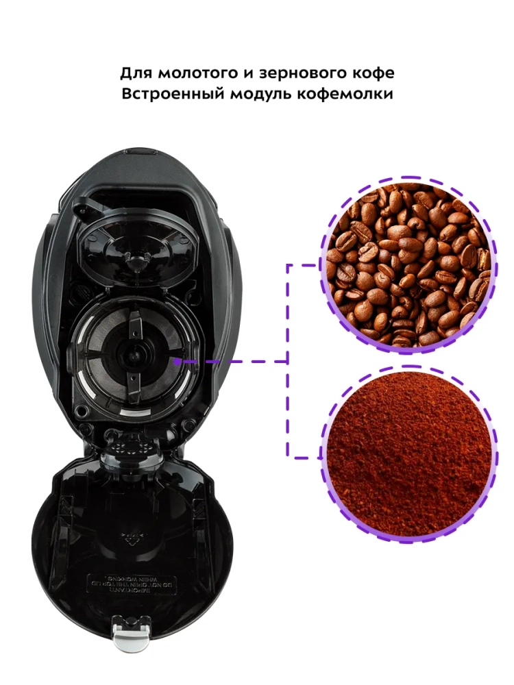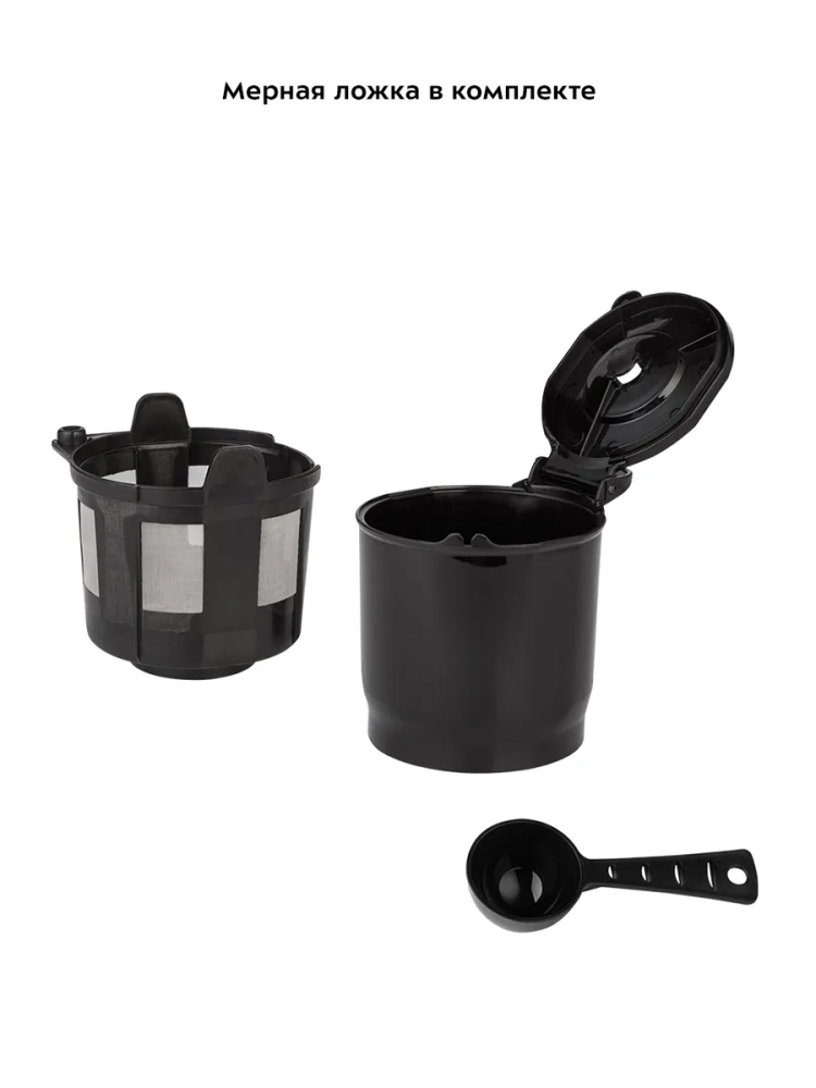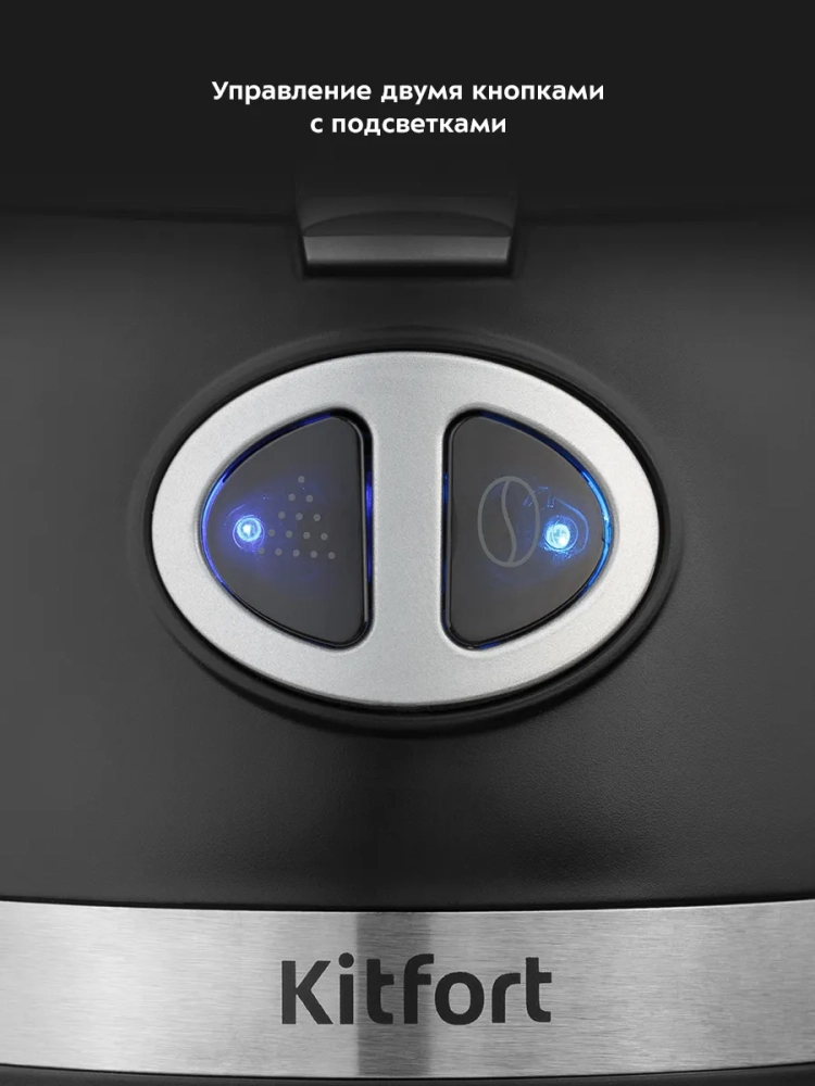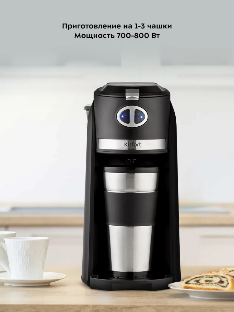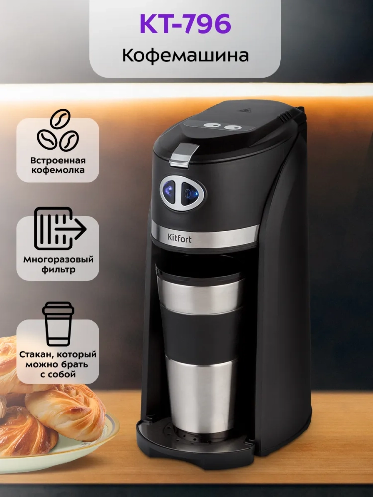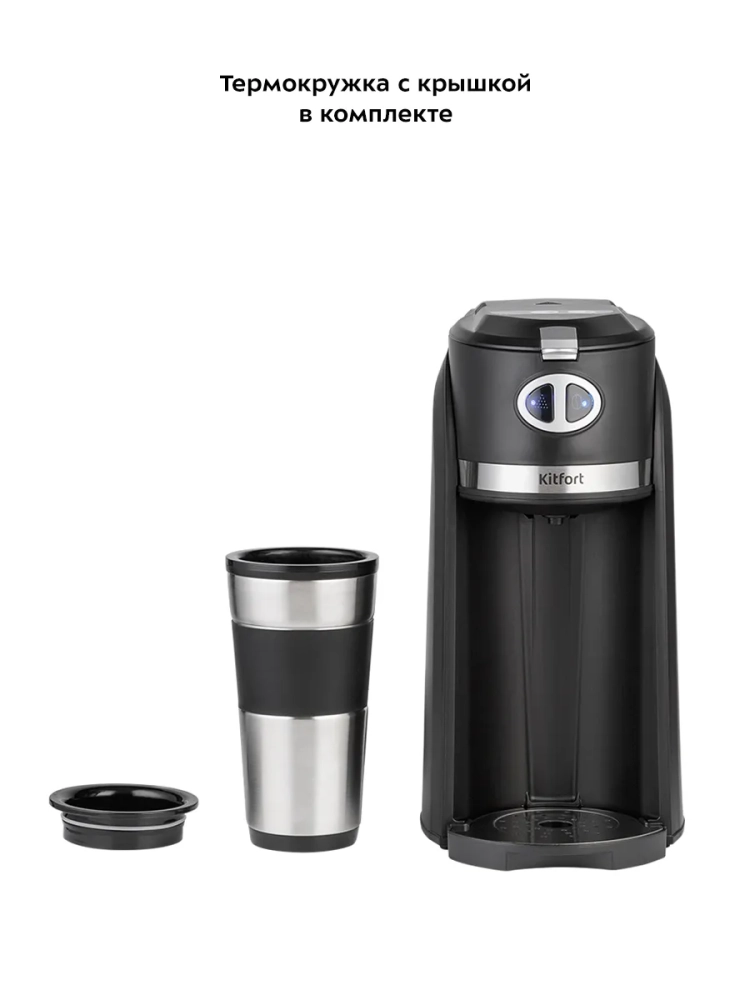 Кофемашина Kitfort КТ-796 готовит ароматный черный кофе по принципу капельной кофеварки одним нажатием кнопки. Встроенная роторная кофемолка автоматически измельчит кофейные зерна сразу в фильтре. В кофемашине вода доводится до температуры 80–90 *С, после чего медленно поступает в фильтр с молотым кофе. Пройдя через него, она попадает в термокружку, которая сохранит тепло вашего кофе. Термокружка выполнена из нержавеющей стали с силиконовой вставкой, которая не дает вам обжечься или выронить из рук термокружку. А крышка термокружки позволяет пить кофе на ходу благодаря удобной форме отверстия для питья, которое можно закрывать, например, при ходьбе. Сетка фильтра кофемашины изготовлена из нержваеющей стали, что значительно продлевает срок службы. Компактная кофемашина KT-796 рассчитана на приготовление кофе за 1 раз на 1–3 чашки. Многоразовый фильтр вмещает 20 грамм кофейных зерен или молотого кофе. А в резервуаре для воды есть специальные отметки 300, 360 и 420 мл, которые помогают налить необходимый объем воды для приготовления кофе. На панели управления кофемашины есть всего две кнопки с подсветкой, что делает процесс приготовления кофе простым и удобным. Также кофемашина оснащена поддоном для сбора капель, который защищает поверхность стола. Кофемашина предназначена для приготовления кофе в домашних условиях или в офисе.