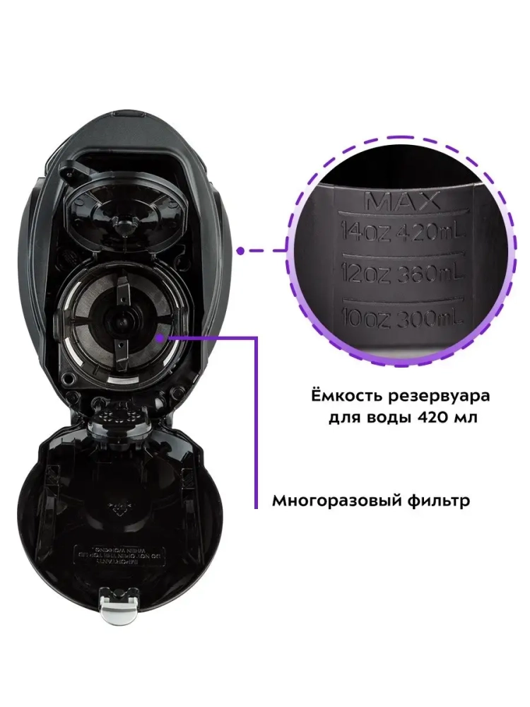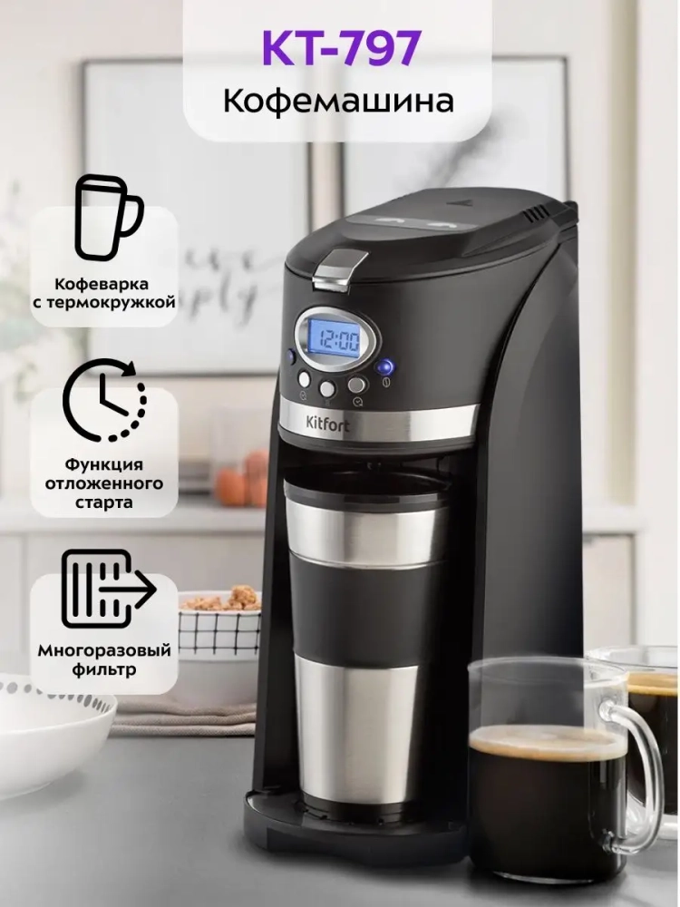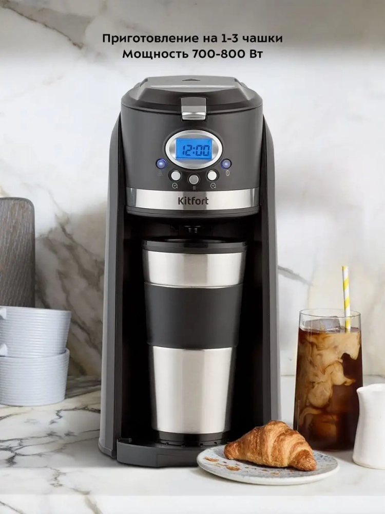 Кофемашина Китфорт КТ-797 готовит ароматный черный кофе по принципу капельной кофеварки одним нажатием кнопки. Встроенная роторная кофемолка автоматически измельчит кофейные зерна сразу в фильтре. В кофемашине вода доводится до температуры 80–90 *С, после чего медленно поступает в фильтр с молотым кофе. Пройдя через него, она попадает в термокружку, которая сохранит тепло вашего кофе. Термокружка выполнена из нержавеющей стали с силиконовой вставкой, которая не дает вам обжечься или выронить из рук термокружку. Крышка термокружки позволяет пить кофе на ходу, благодаря удобной форме отверстия для питья, которое можно закрывать, например, при ходьбе. Сетка фильтра кофемашины изготовлена из нержавеющей стали, что значительно продлевает срок службы фильтра. Кофемашина KT-797 не скользит по поверхности стола, благодаря наличию прорезиненных ножек. Компактная кофемашина KT-797 рассчитана на приготовление кофе за 1 раз на 1–3 чашки. Многоразовый фильтр вмещает 20 грамм кофейных зерен или молотого кофе. А в резервуаре для воды есть специальные отметки 300, 360 и 420 мл, которые помогают налить необходимый объем воды для приготовления кофе. Кофемашина KT-797 оборудована дисплеем, который показывает текущее время и заданные настройки. Функция отложенного старта позволит начать приготовление в заданное вами время. Вам больше не придется вставать утром на 20 минут раньше, чтобы успеть сделать себе ароматный кофе. Также кофемашина оснащена поддоном для сбора капель, который защищает поверхность стола. Кофемашина предназначена для приготовления кофе в домашних условиях или в офисе.