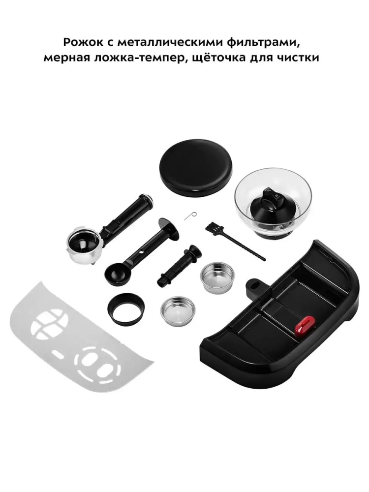 Металлический фильтр с лазерным нанесением отверстий долговечен и не требует использования каких-либо расходующихся частей. Кофейная станция оснащена съемным резервуаром для воды и металлическим рожком. Металлический рожок хорошо прогревает напиток, а сам напиток получается насыщенным, густым и с хорошей пенкой. Мерная ложка-темпер поможет наполнить рожок и утрамбовать в нем кофейную таблетку.