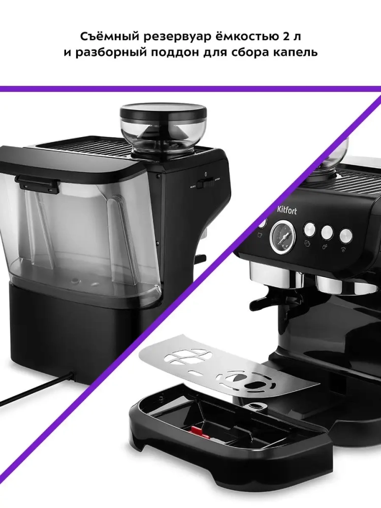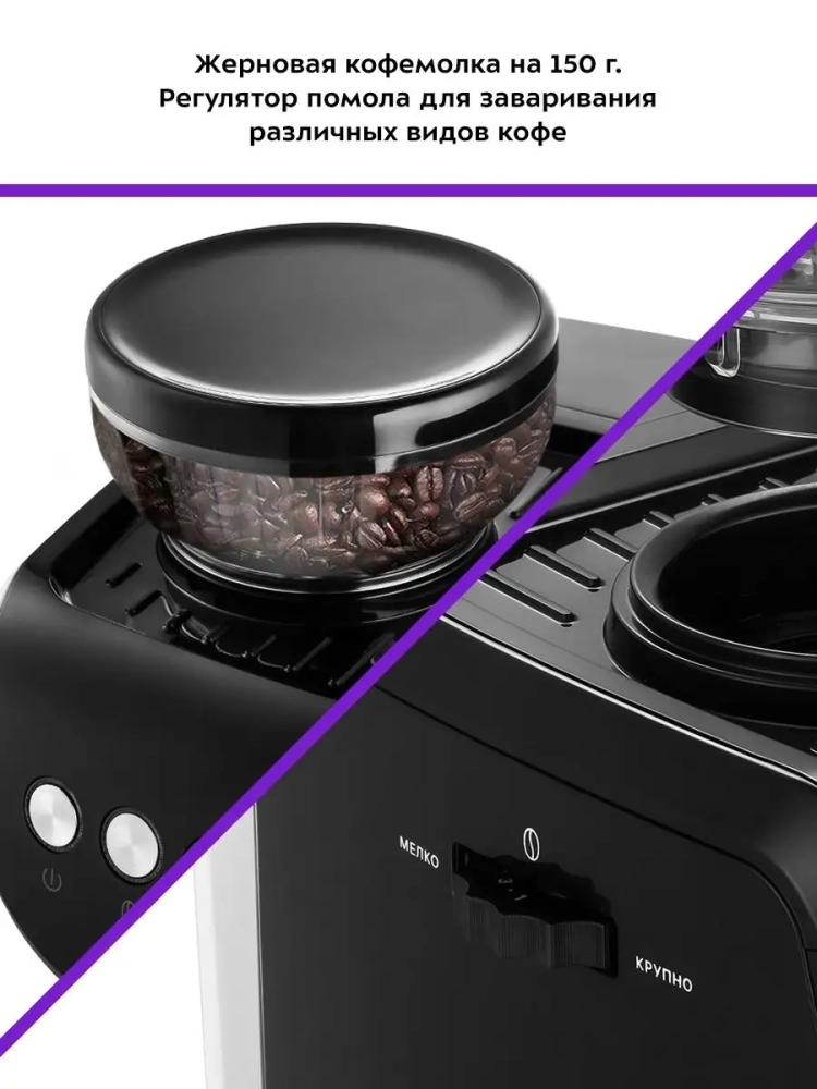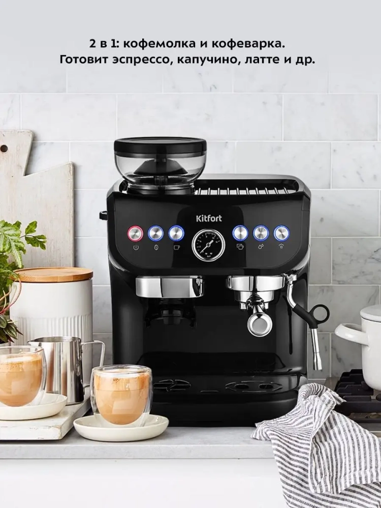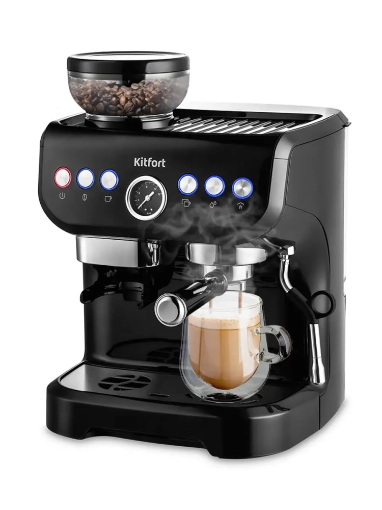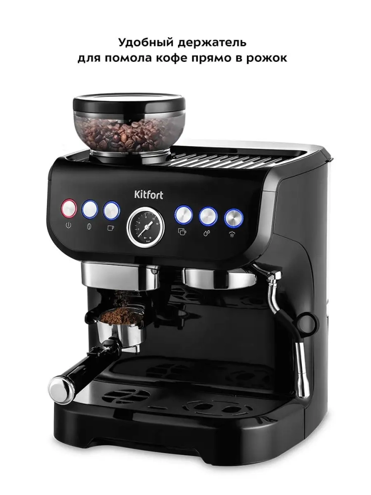 Кофейная станция Китфорт КТ-7108 сочетает в себе два устройства в одном корпусе. Встроенная кофемолка с коническими металлическими жерновами позволяет качественно измельчать кофейные зерна непосредственно перед приготовлением кофе, что положительно отражается на вкусе готового напитка.