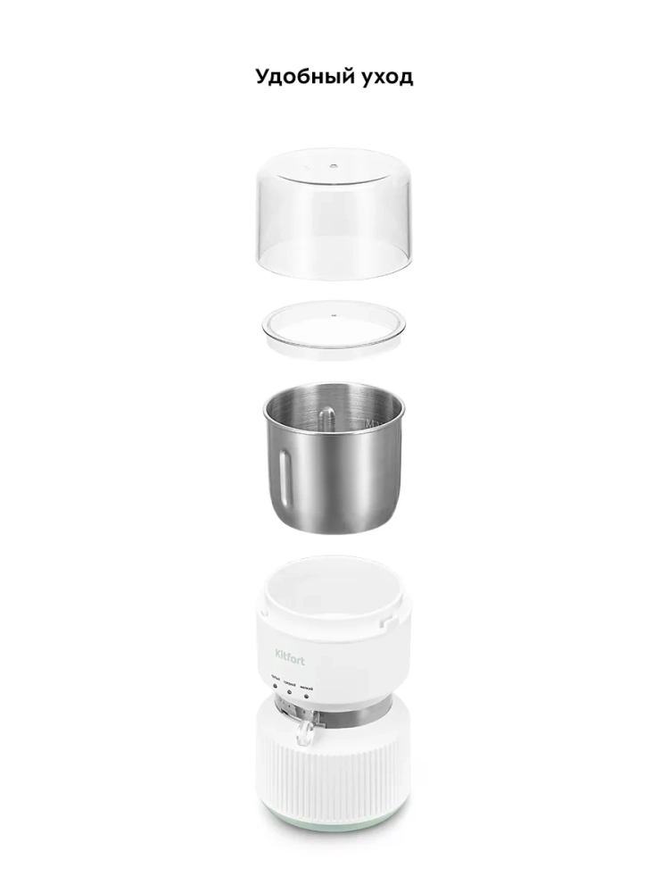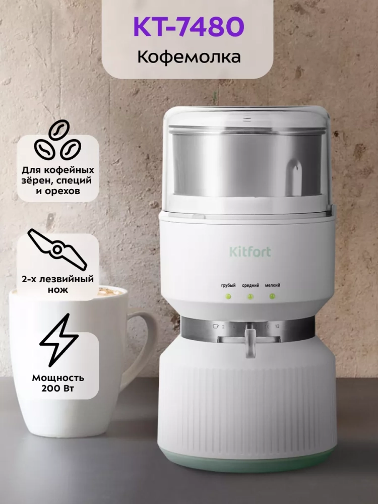 Кофемолка Kitfort КТ-7480 предназначена для помола кофейных зерен. Вы также можете использовать устройство для измельчения специй или орехов. В чаше кофемолки закреплен блок ножей с лезвиями. Ножи и чаша выполнены из нержавеющей стали. При включении кофемолки ножи быстро вращаются и рубят ингредиенты. Съемная чаша удобна для извлечения перемолотых ингредиентов.