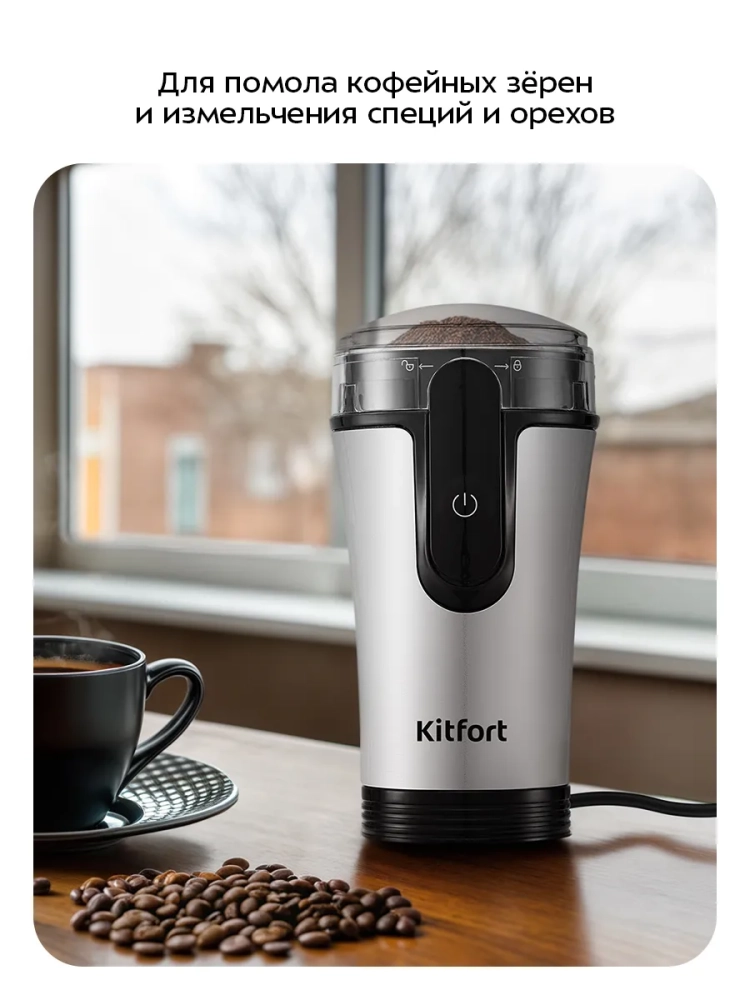 Кофемолка Kitfort КТ-7654 предназначена для помола кофейных зерен. Вы также можете использовать устройство для измельчения специй или орехов. В чаше кофемолки закреплен блок ножей, которые выполнены из нержавеющей стали. При включении кофемолки ножи быстро вращаются и рубят ингредиенты.