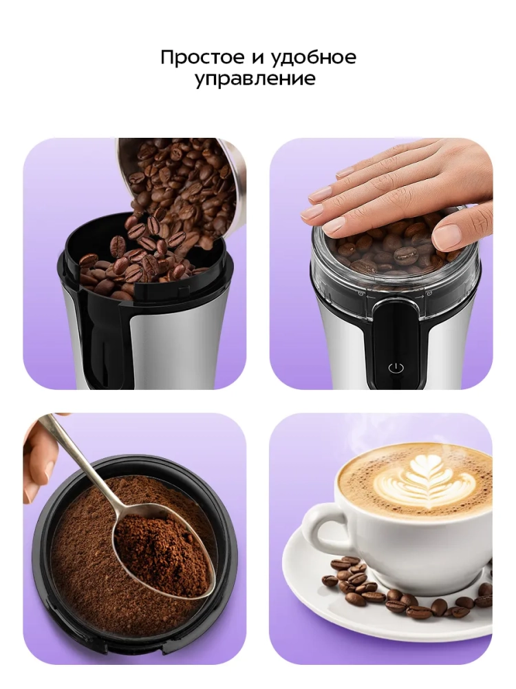 Степень помола зависит от продолжительности работы устройства. Через прозрачную крышку можно наблюдать за процессом измельчения.