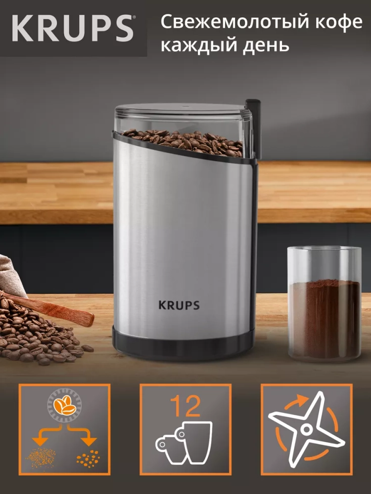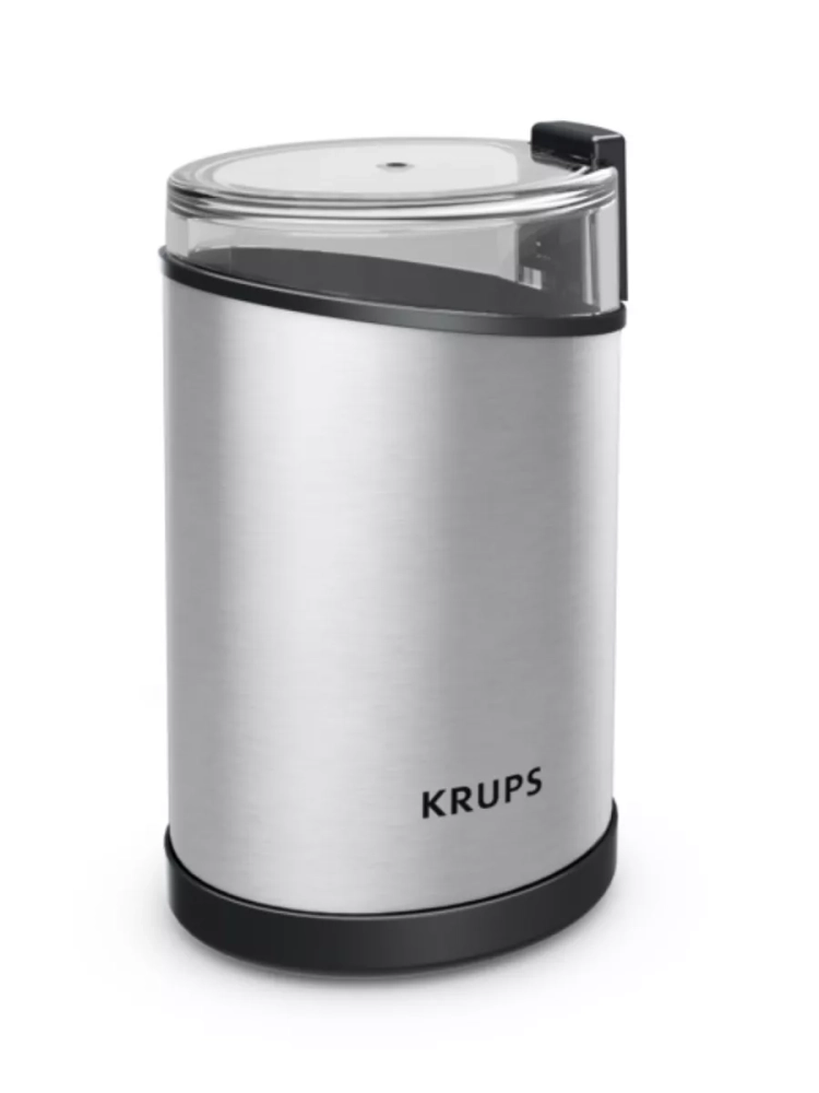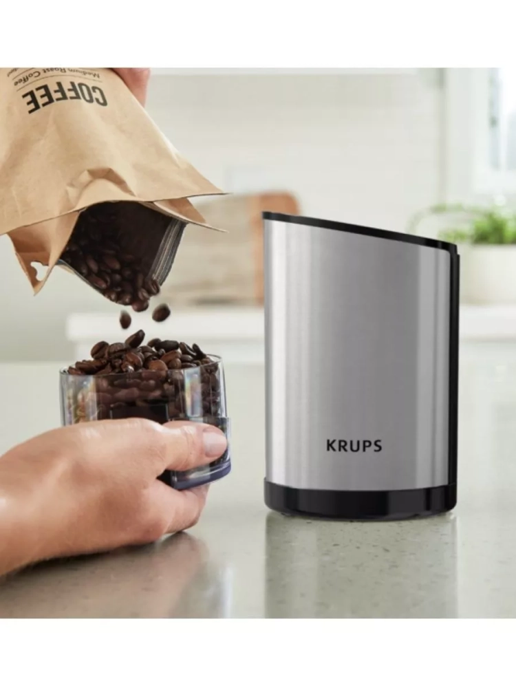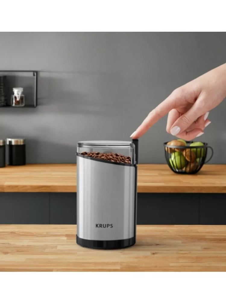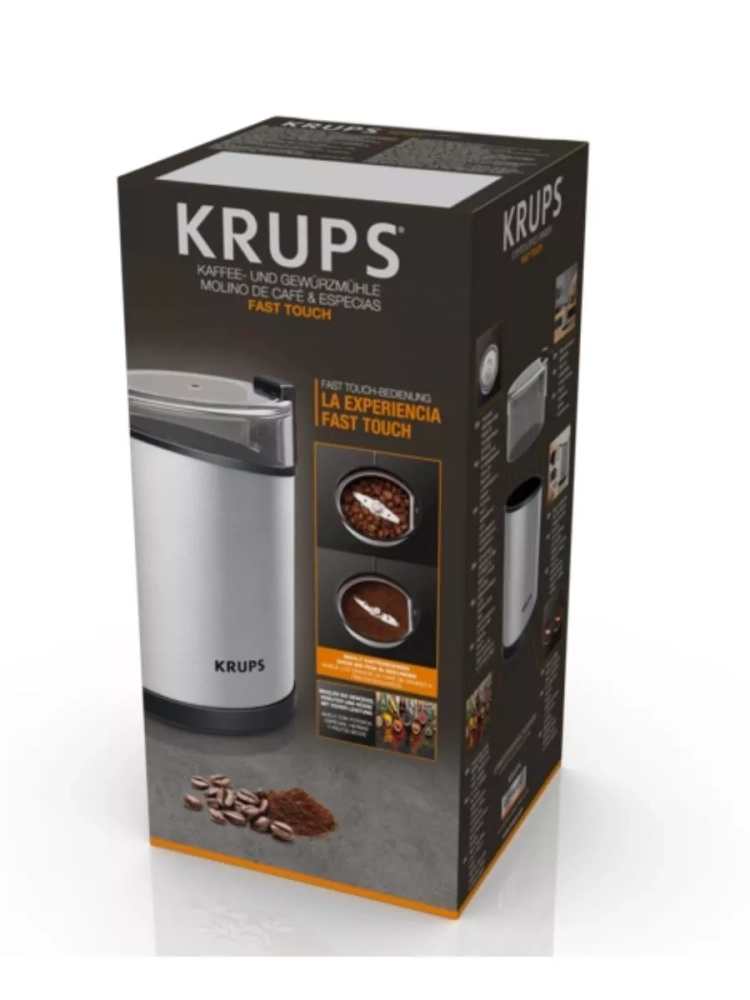 Электрическая кофемолка Krups Fast Touch GX204D10. Прочные лезвия из нержавеющей стали обеспечивают однородное измельчение и желаемую консистенцию. Кофемолка вмещает 85 г кофейных зерен - этого количества хватит для приготовления 12 чашек кофе. Идеально для ежедневного использования и особых случаев. Кофемолка начинает измельчение одним нажатием, но только при плотно закрытой крышке в целях безопасности.