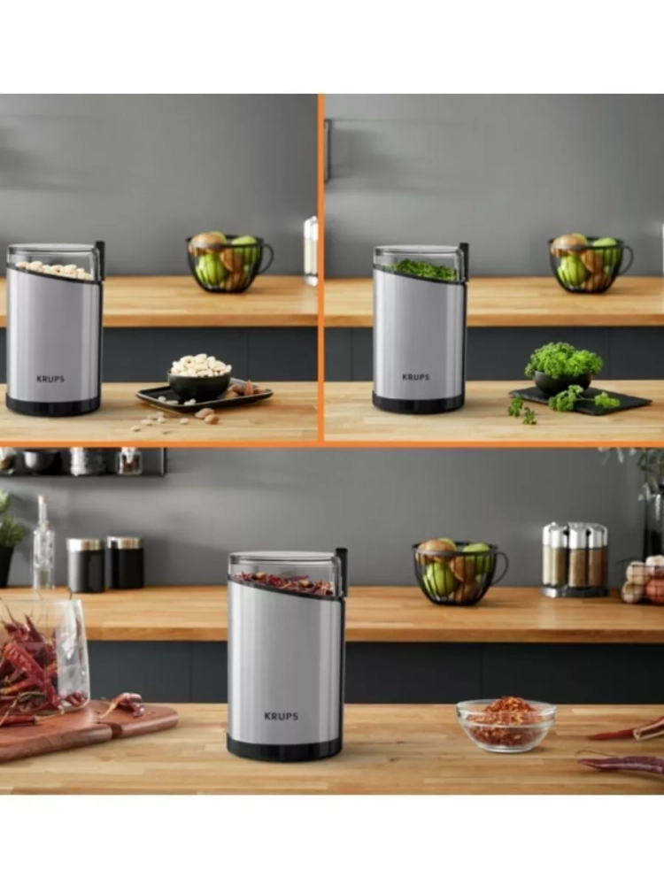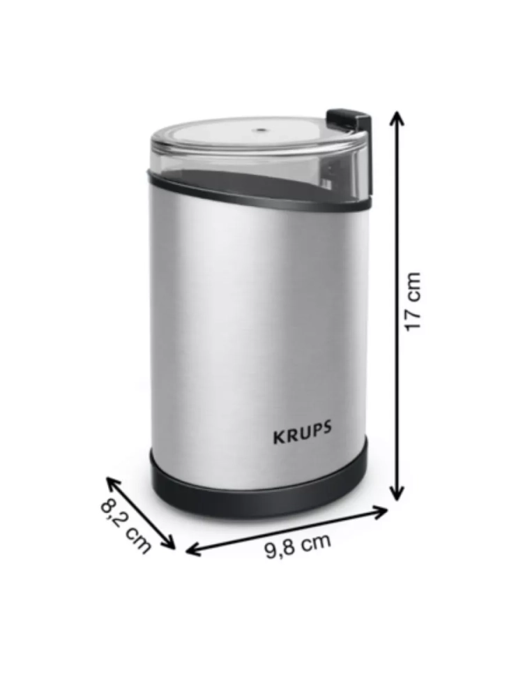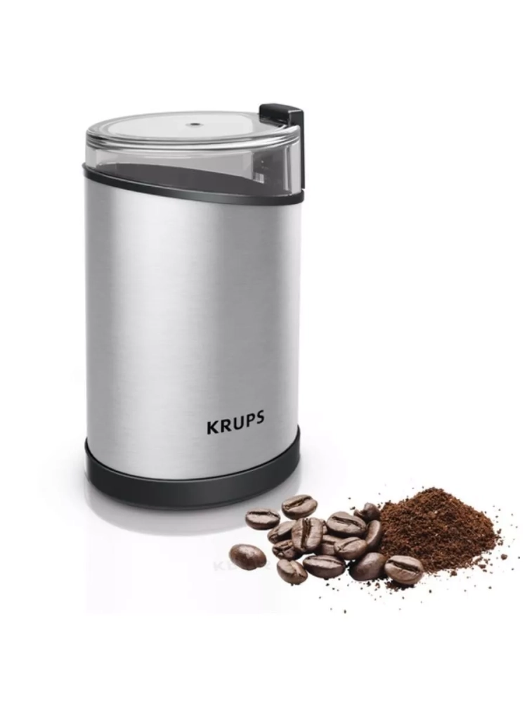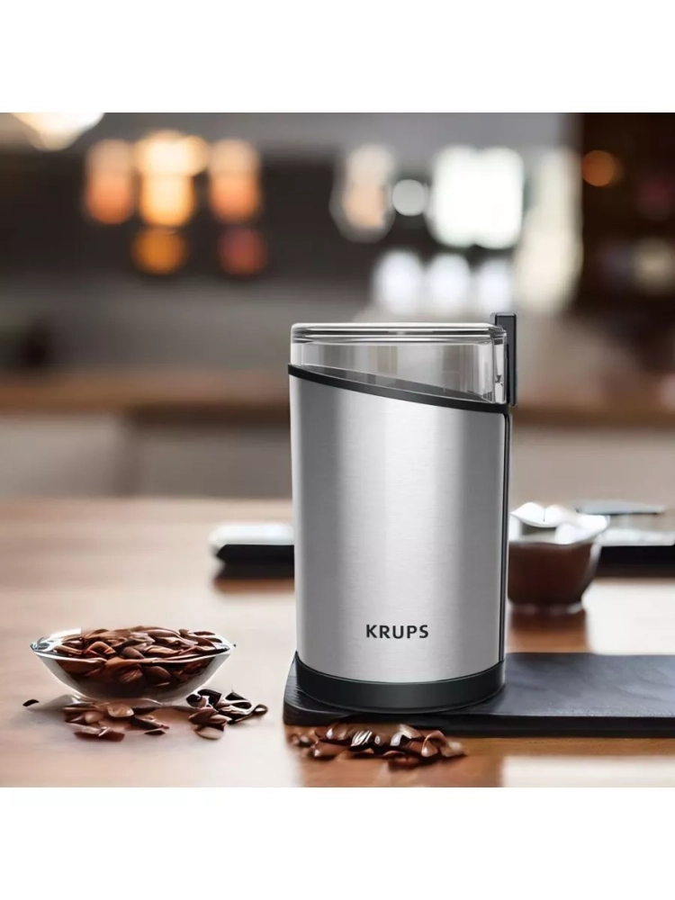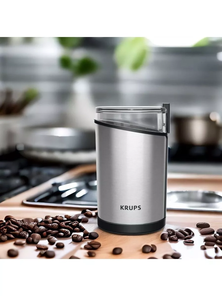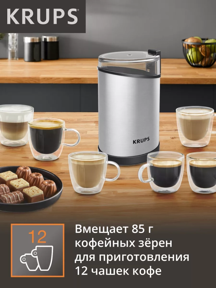 Электрическая кофемолка Krups Fast Touch GX204D10. Прочные лезвия из нержавеющей стали обеспечивают однородное измельчение и желаемую консистенцию. Кофемолка вмещает 85 г кофейных зерен - этого количества хватит для приготовления 12 чашек кофе. Идеально для ежедневного использования и особых случаев. Кофемолка начинает измельчение одним нажатием, но только при плотно закрытой крышке в целях безопасности.