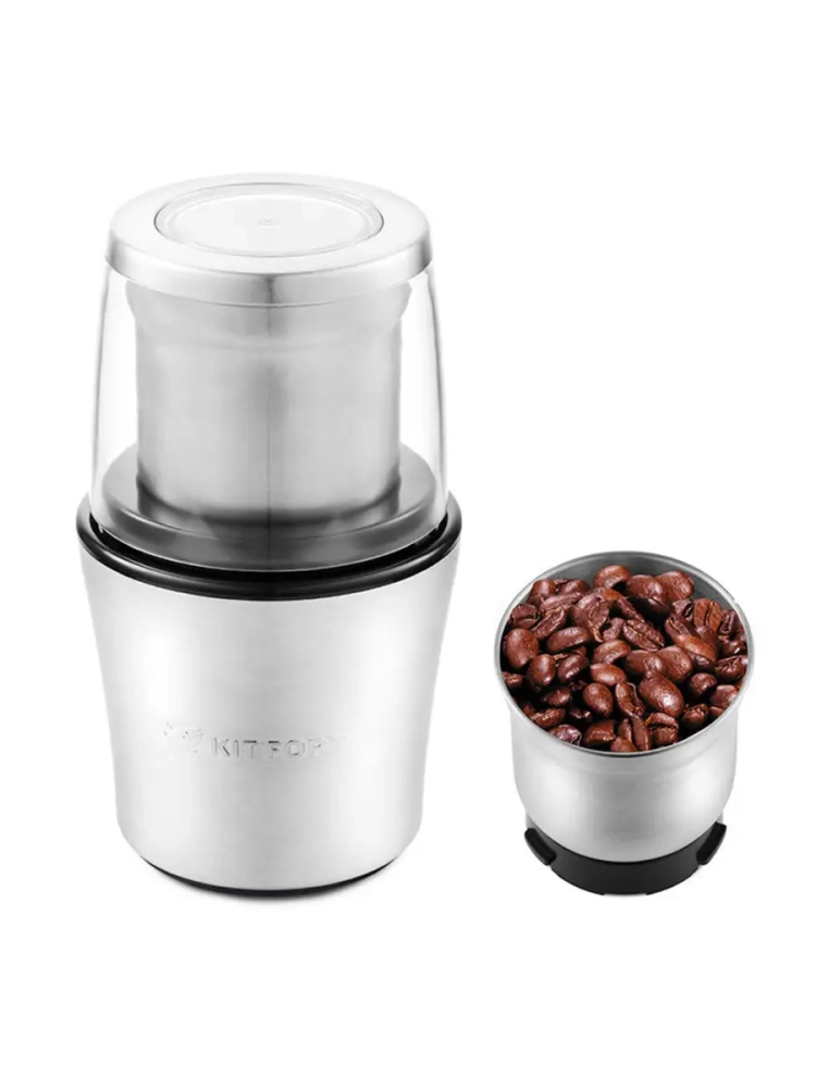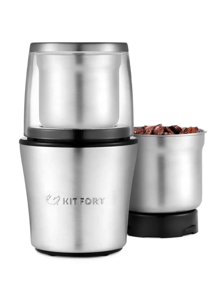Мощная кофемолка 2 в 1 Kitfort KT-1329 в корпусе из нержавеющей стали предназначена для помола кофейных зёрен и измельчения специй и орехов. Она укомплектована прозрачной крышкой и двумя съёмными чашами. Первая чаша оснащена двухсторонним ножом для кофейных зёрен (дробилкой), вторая - четырёхсторонним ножом для измельчения.