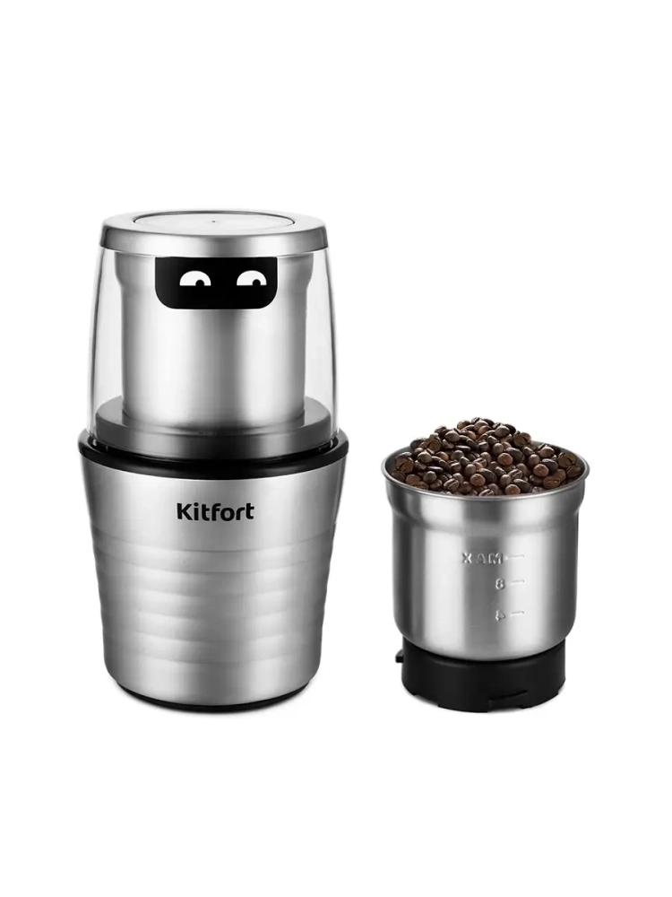 Кофемолка КТ-773 предназначена для помола кофейных зерен и измельчения специй и орехов. Кофемолка укомплектована двумя съемными чашами: чашей для кофе и чашей для специй. В чаше для кофе установлен двулезвийный нож для эффективного помола зерен кофе, а в чаше для специй - четырехлезвийный нож для измельчения. Ножи выполнены из нержавеющей стали. При включении кофемолки ножи быстро вращаются, измельчая продукты. Степень помола зависит от продолжительности. Корпус кофемолки выполнен из металла в сочетании с пластиком. На дне корпуса есть специальные прорезиненные нескользящие ножки, которые придают устойчивость прибору во время работы, а также отсек для намотки шнура. Кофемолка проста в эксплуатации: нет никаких лишних кнопок, а включается она простым нажатием на верхнюю крышку. Защитный механизм не позволит включить кофемолку, если верхняя крышка не установлена.