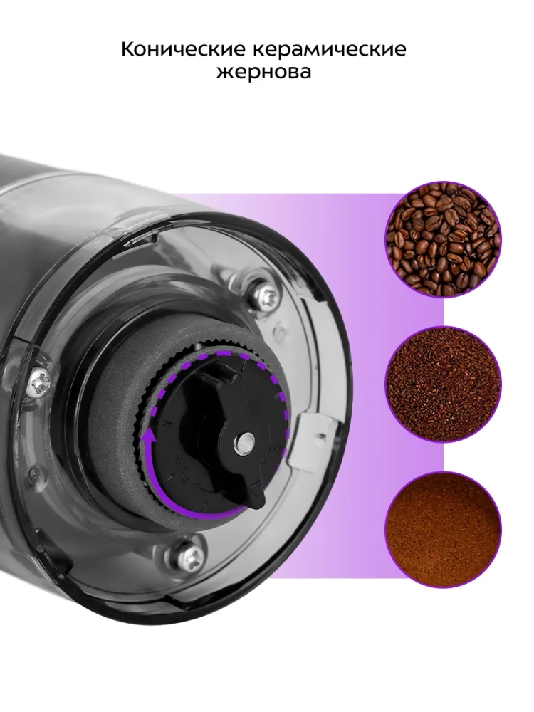 Конические жернова — это два конуса, один в другом. Внешний конус остается неподвижным, а внутренний вращается. Зерно, оказываясь между жерновами, перемалывается, продвигаясь вниз. Регулируемое расстояние между жерновами позволяет настроить степень помола: от тонкого — для использования в рожковой кофеварке, до грубого — для кофе во френч-прессе.