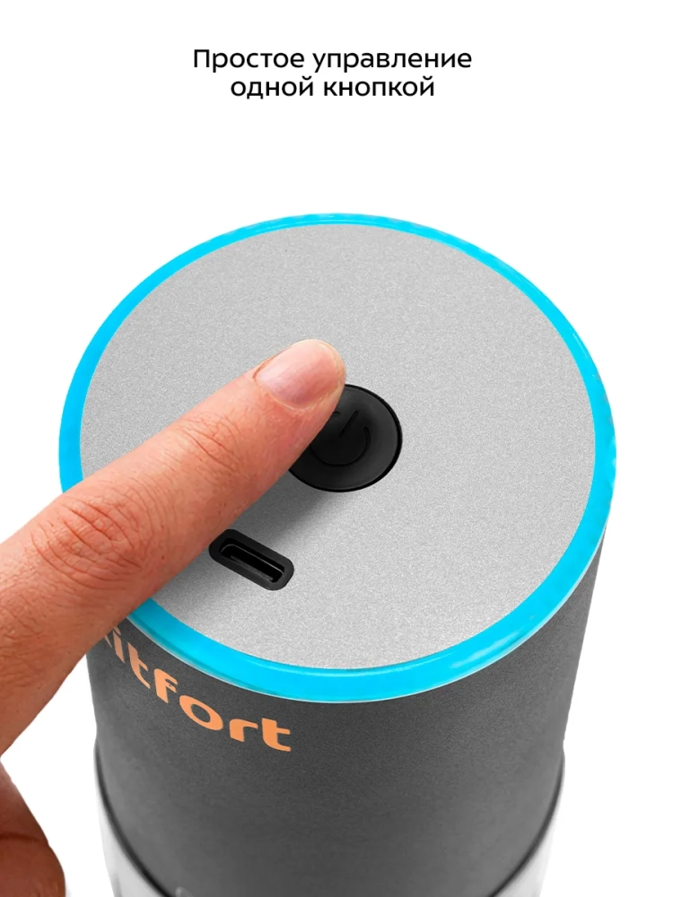 Управление кофемолкой осуществляется с помощью одной кнопки. Устройство работает от аккумулятора. Во время помола и зарядки горит подсветка на моторном блоке.