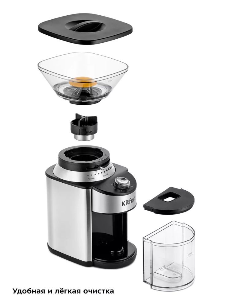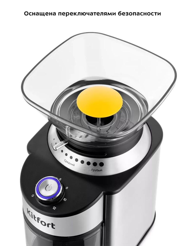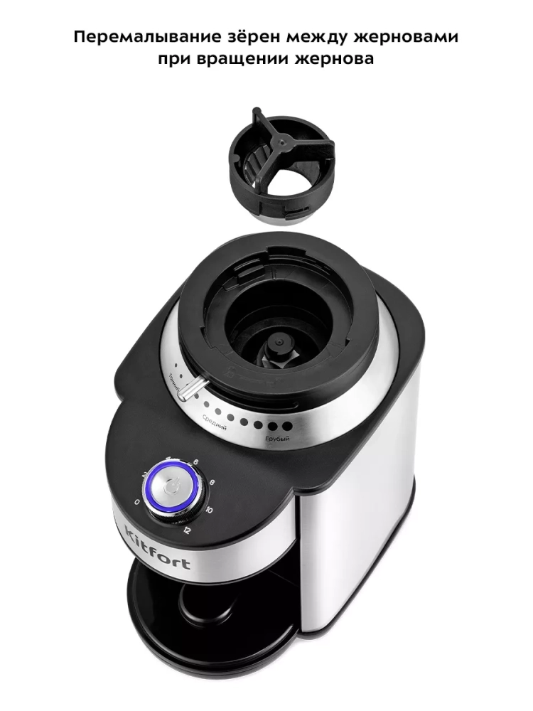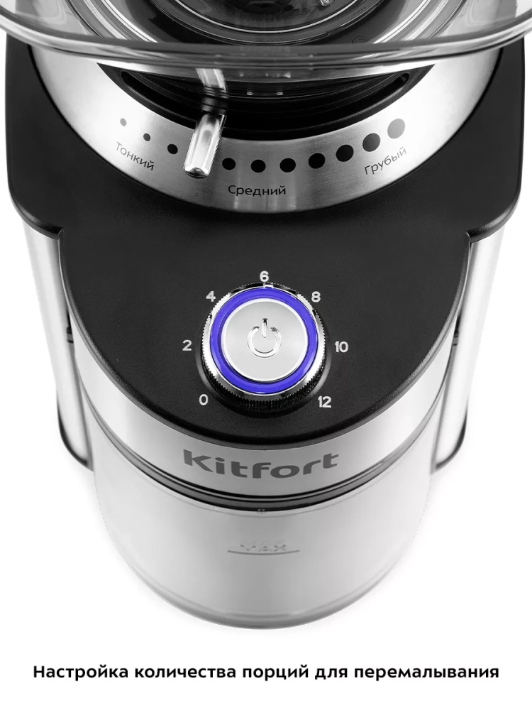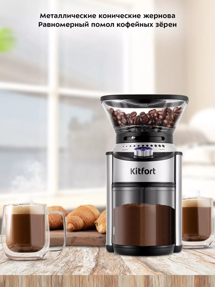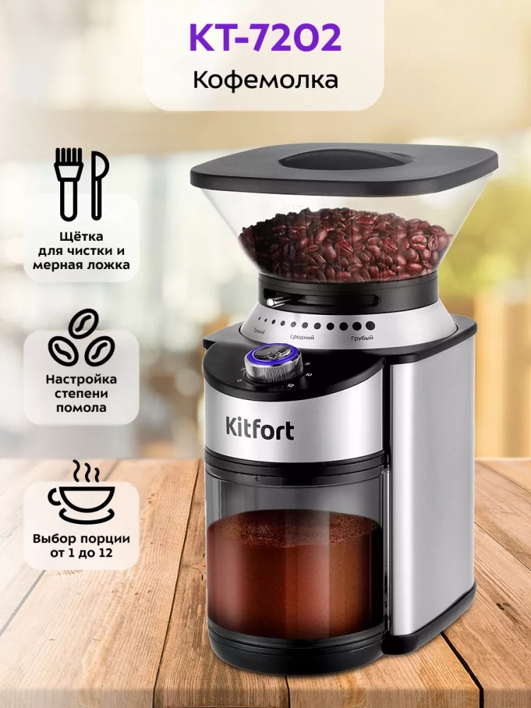 Жерновая кофемолка Kitfort КТ-7202 предназначена для помола кофейных зерен. Она оснащена коническими металлическими жерновами.