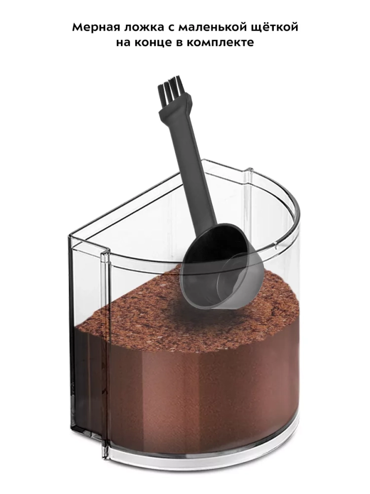 Контейнеры для молотого кофе и для зерен съемные и закрываются крышками. Внешний жернов также съемный — для удобства очистки. В комплекте предусмотрена мерная ложка с маленькой щеткой на конце для чистки жерновов.