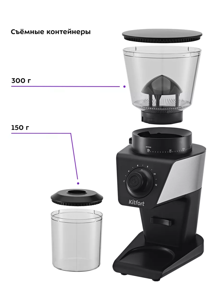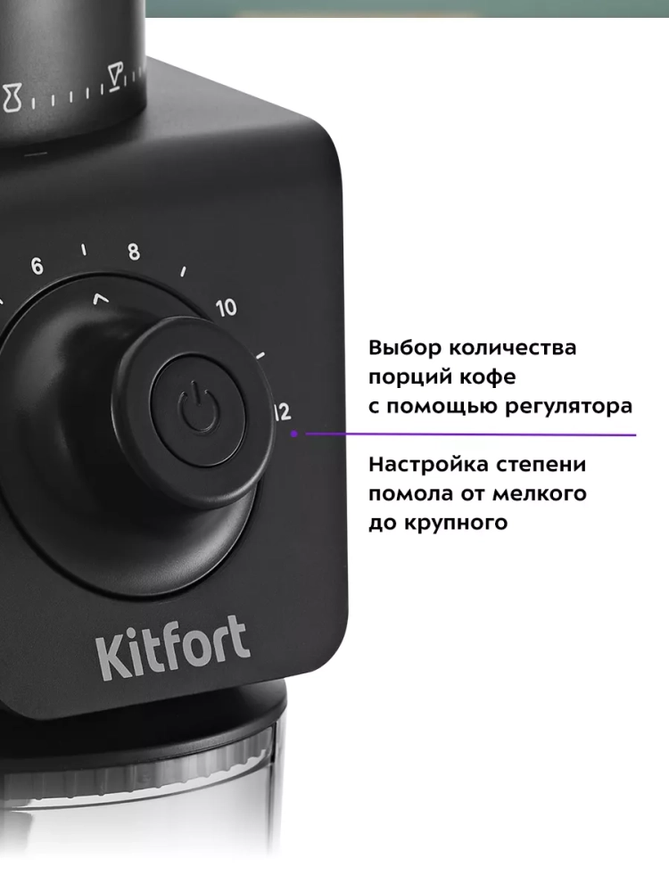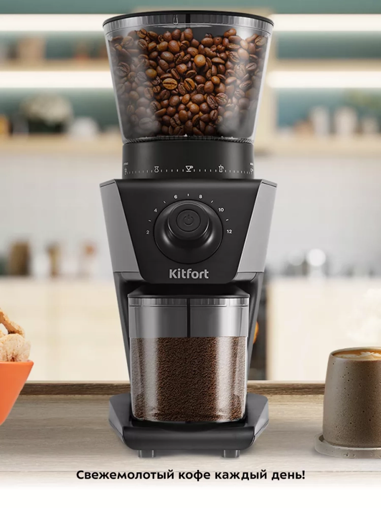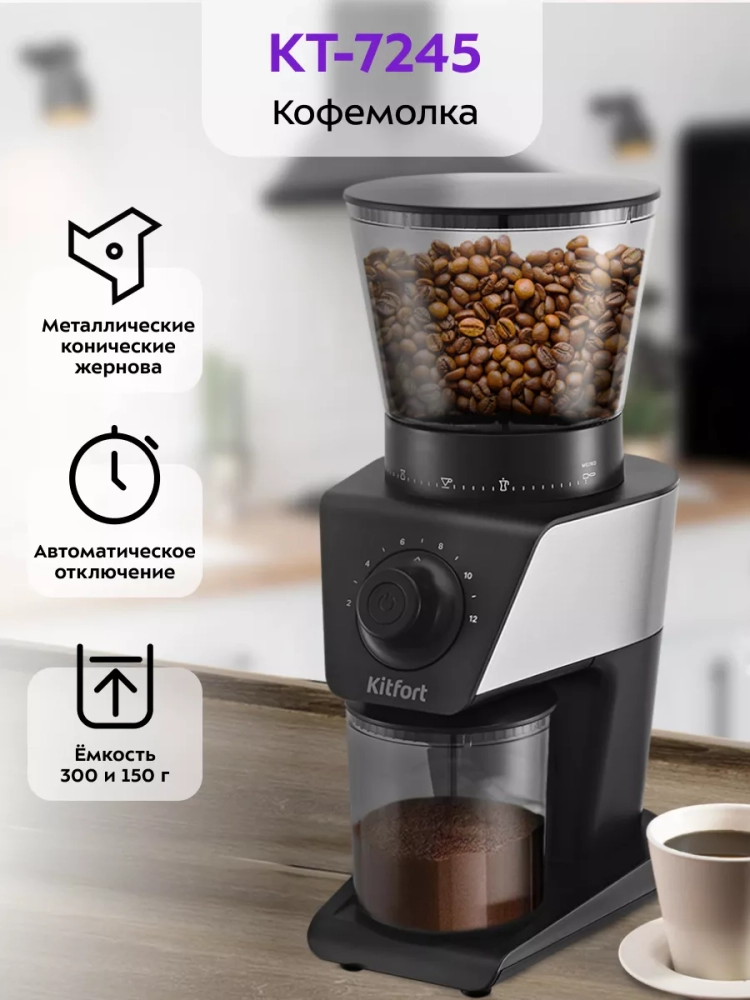Жерновая кофемолка Kitfort КТ-7245 предназначена для помола кофейных зерен. Она оснащена коническими жерновами из нержавеющей стали.