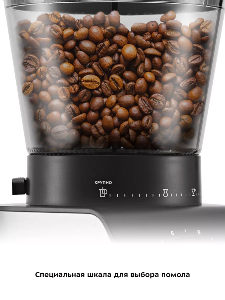 Жерновая кофемолка дает равномерный помол и позволяет настроить его степень: от мелкого — для рожковой кофеварки, до крупного — для френч-пресса. Равномерный помол важен для рожковых кофеварок: при неравномерном помоле вкус заваренного кофе портится. При помоле в жерновой кофемолке кофе не перегревается, как это происходит в роторных кофемолках. Вы можете выбрать, какое количество порций молотого кофе требуется намолоть за один раз. Количество порций представлено в условных единицах и примерно равно количеству чашек эспрессо. После завершения работы кофемолка автоматически выключится.