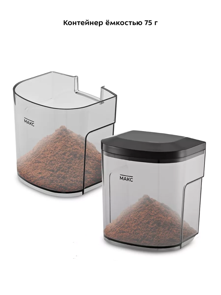 Контейнеры для молотого кофе и для зерен съемные и закрываются крышками. Внешний жернов также съемный — для удобства очистки. В комплекте предусмотрена щетка для чистки жерновов.