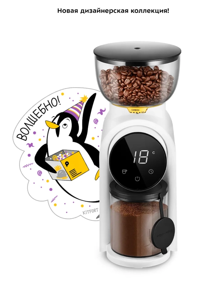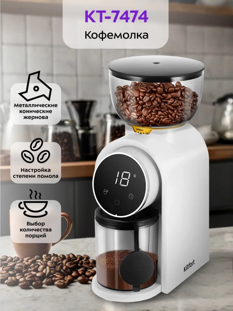 Жерновая кофемолка Kitfort КТ-7474 предназначена для помола кофейных зерен. Она оснащена коническими жерновами из нержавеющей стали.