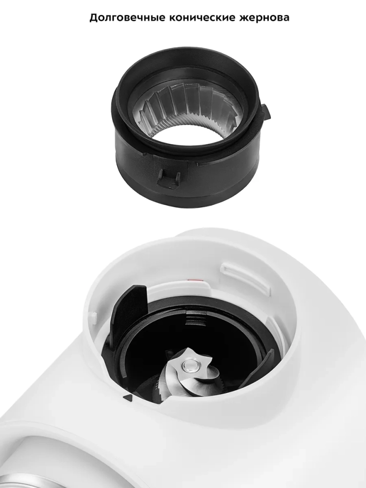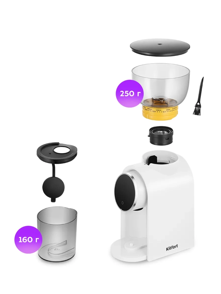 Контейнеры для молотого кофе и для зерен съемные и закрываются крышками. Внешний жернов также съемный — для удобства очистки. В комплекте предусмотрена щетка для чистки.