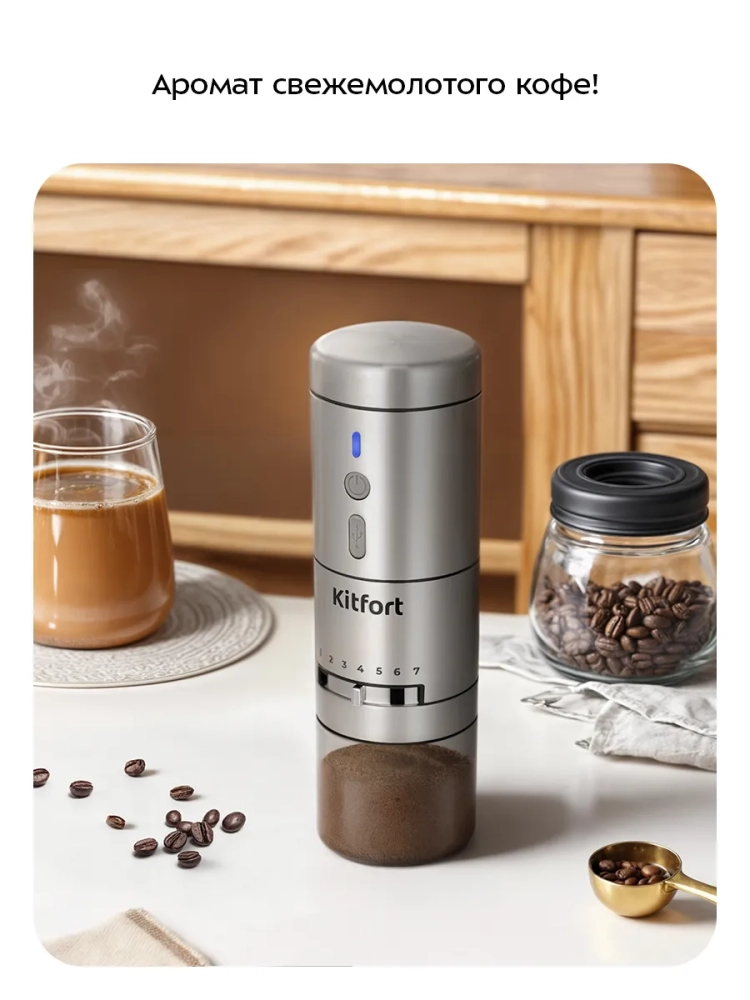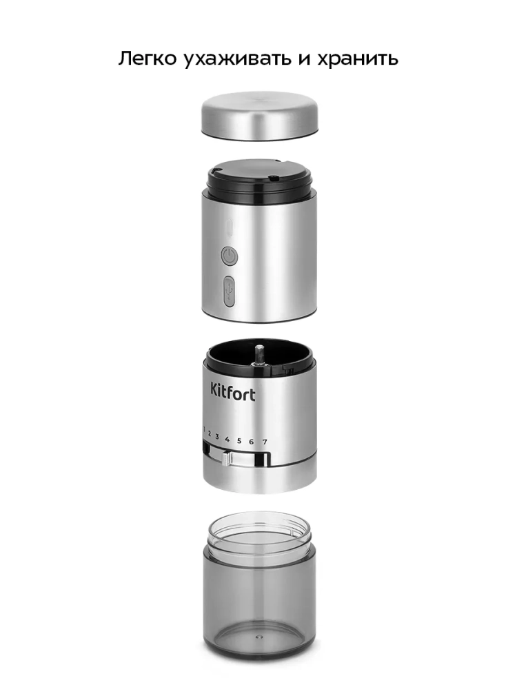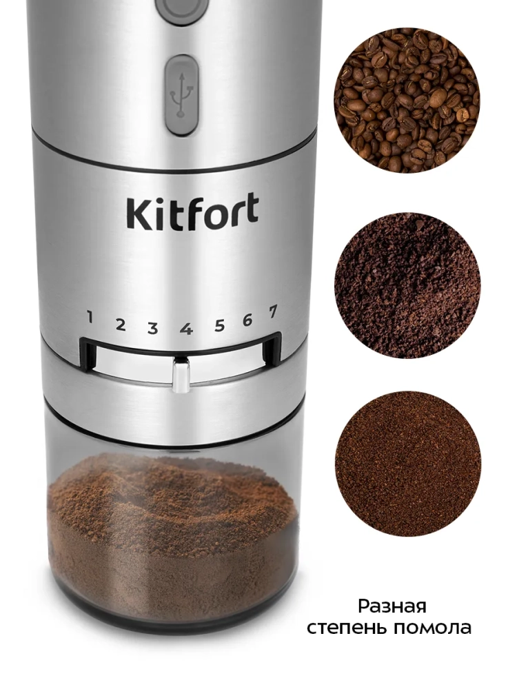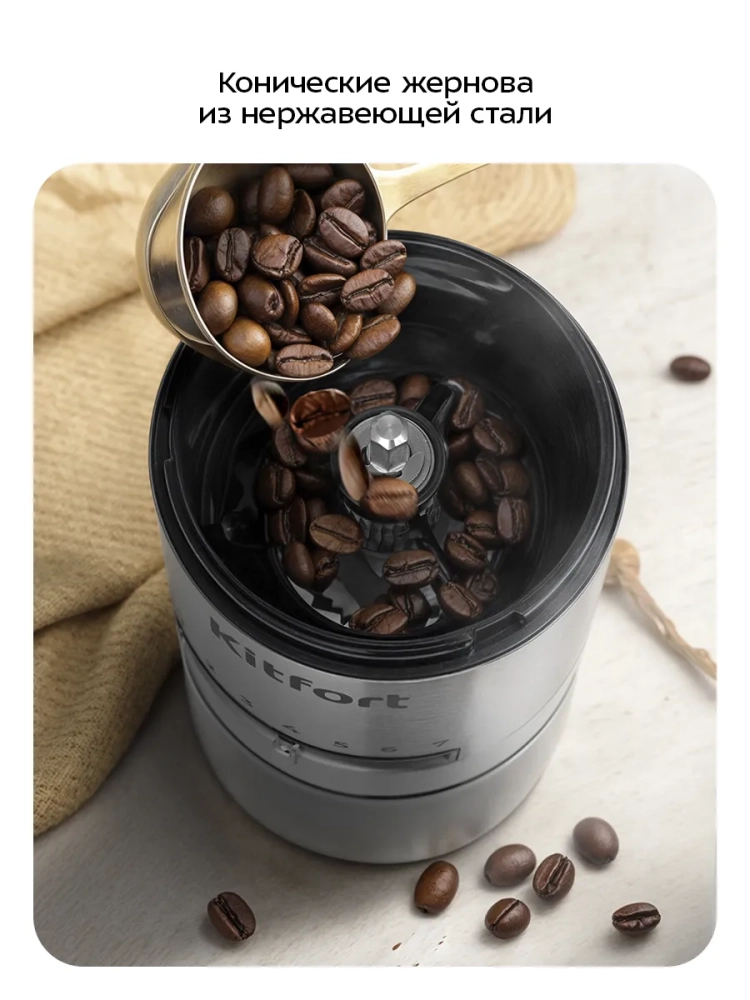 Жерновая кофемолка Kitfort КТ-7537 предназначена для помола кофейных зерен. Устройство оснащено коническими жерновами из нержавеющей стали.