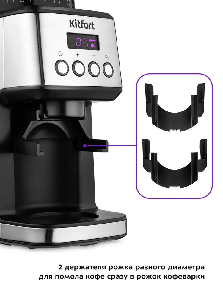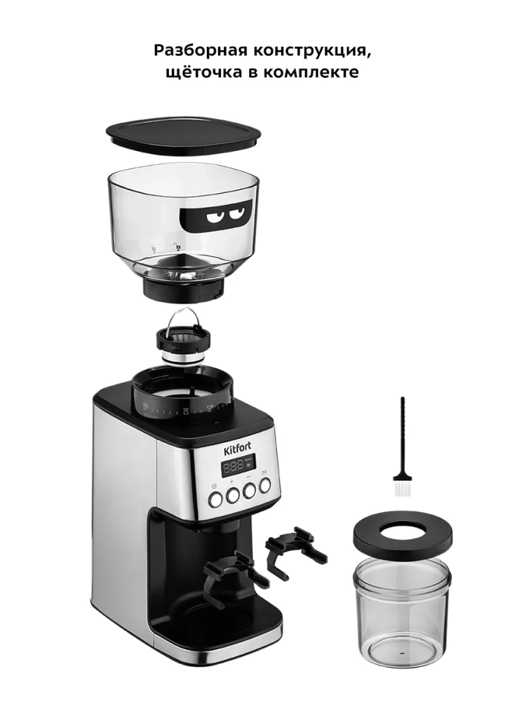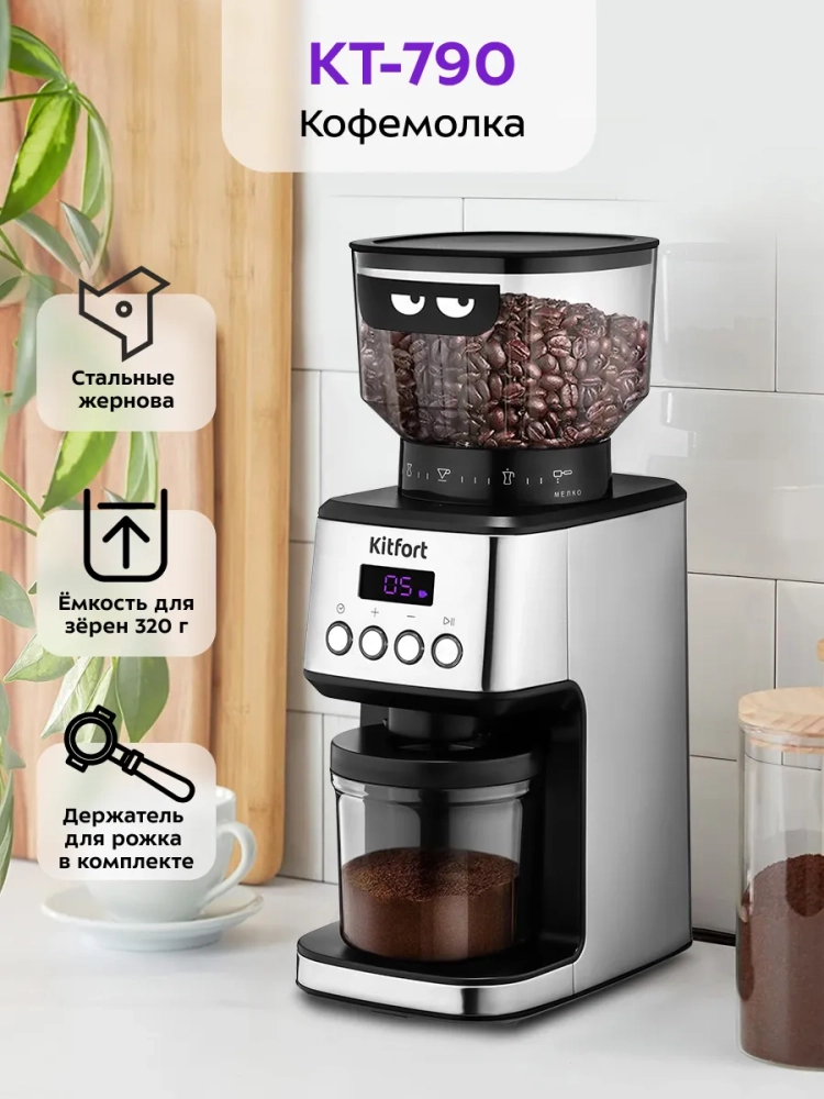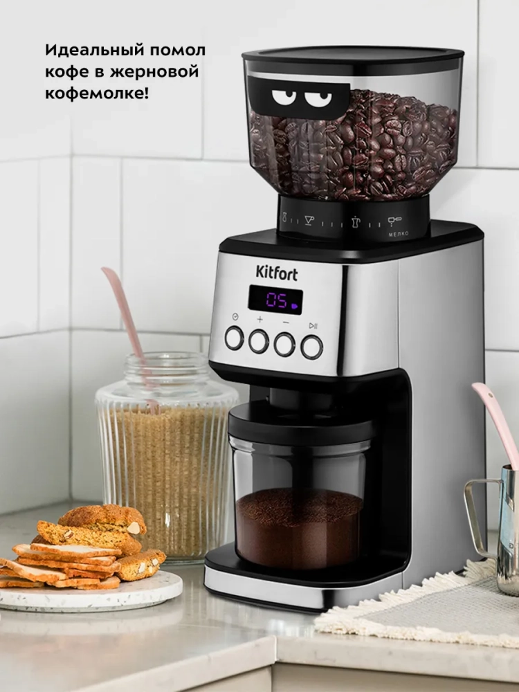 Жерновая кофемолка Kitfort КТ-790 предназначена для помола кофейных зерен. Она оснащена стальными коническими жерновами. Жерновая кофемолка дает равномерный помол и позволяет настроить его степень: от мелкого — для эспрессо кофеварки, до крупного — для френч-пресса. Равномерный помол важен для эспрессо кофеварок: при неравномерном помоле вкус заваренного кофе портится. При помоле в жерновой кофемолке кофе не перегревается, как это происходит в роторных кофемолках. Конические жернова — это два конуса, один установлен в другой. Внешний конус остается неподвижным, а внутренний вращается. Зерно, попадая между жерновами, перемалывается, продвигаясь вниз. Такие жернова позволяют перемалывать зерна за короткий промежуток времени, не перегревая их. Контейнеры для молотого кофе и для зерен съемные. Внешний жернов также съемный — для удобства очистки. Кофемолка оснащена переключателями безопасности: она не включится без контейнера для зерен. В случае перегрева двигателя сработает термопредохранитель и отключит его. Нескользящие ножки делают прибор устойчивее на поверхности.