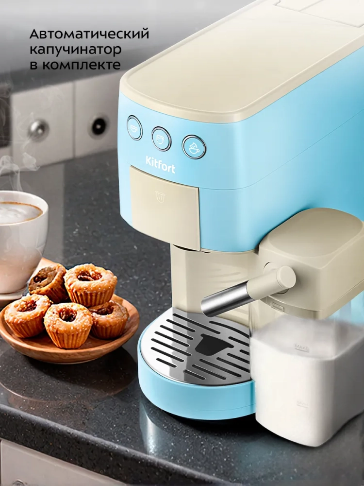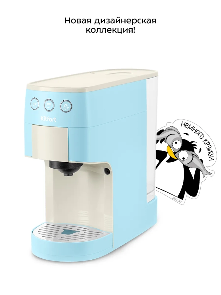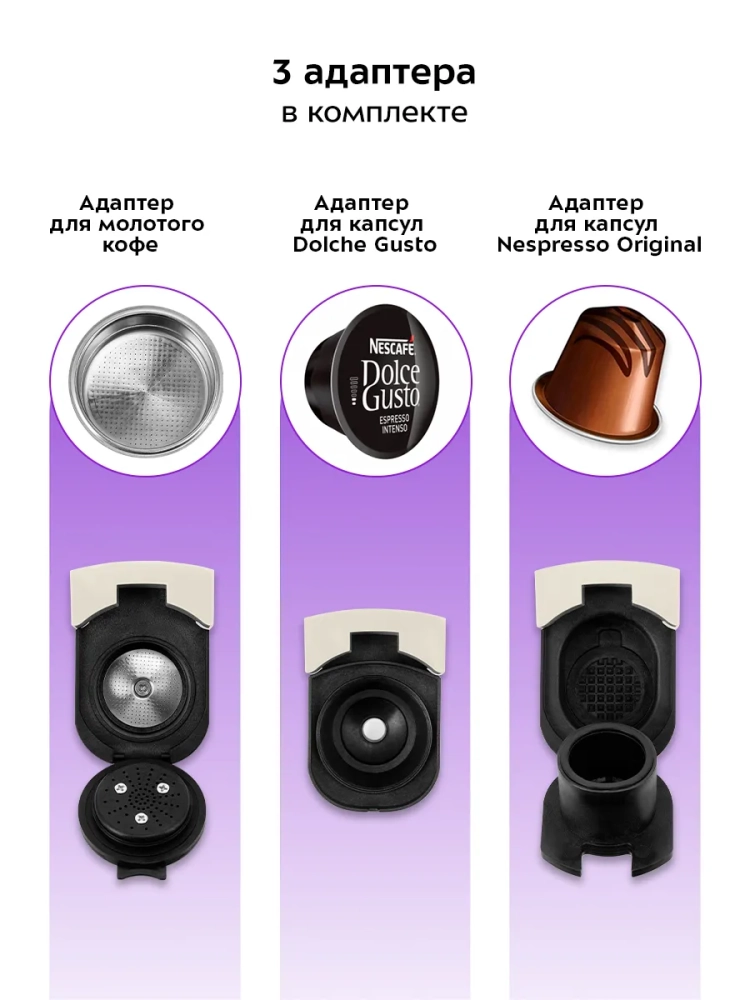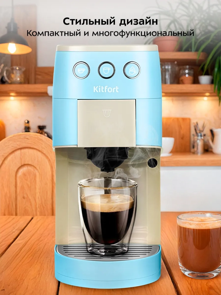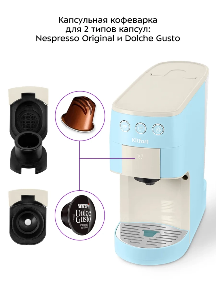 Кофеварка «3 в 1» Kitfort КТ-7466 — многофункциональное устройство, сочетающее в себе функции капсульной и рожковой кофеварки. Благодаря адаптерам кофеварка подходит для капсул типа Nespresso Original и Dolce Gusto, а также для молотого кофе.