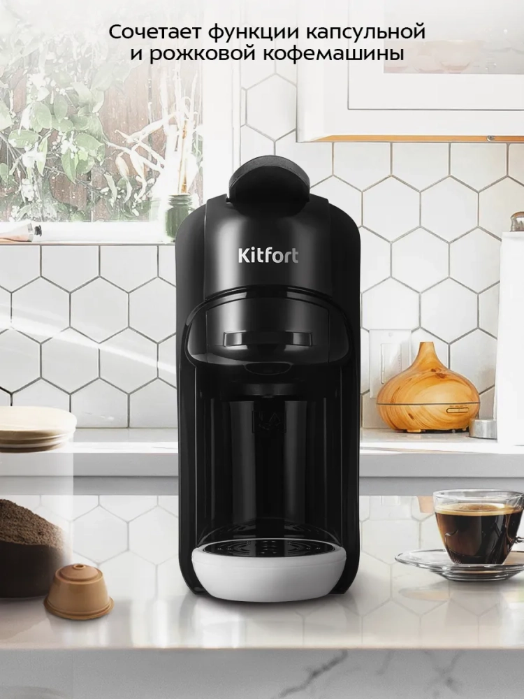 Кофеварка «3 в 1» Kitfort КТ-7546 — многофункциональное устройство, сочетающее в себе функции капсульной и рожковой кофеварки. Благодаря адаптерам кофеварка подходит для капсул типа Nespresso и Dolce Gusto, а также для молотого кофе.