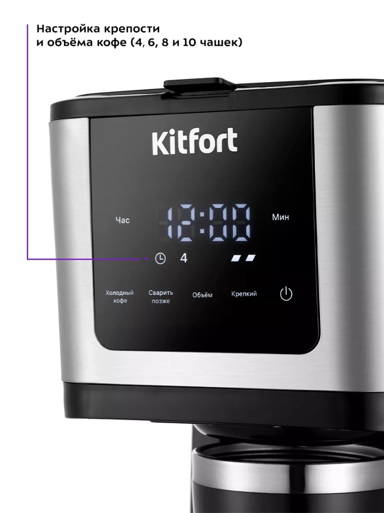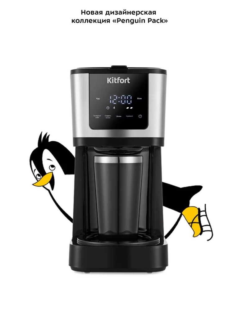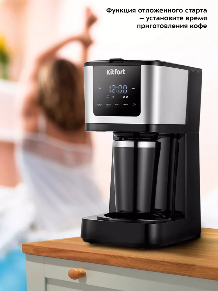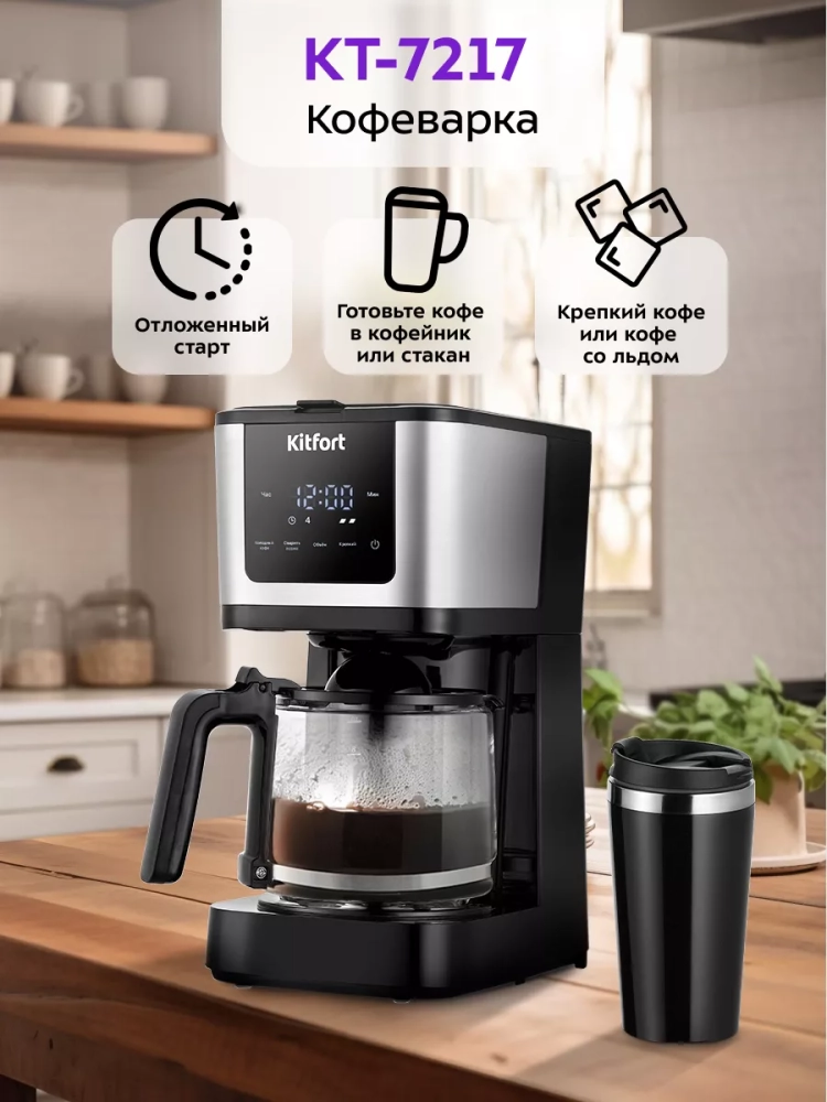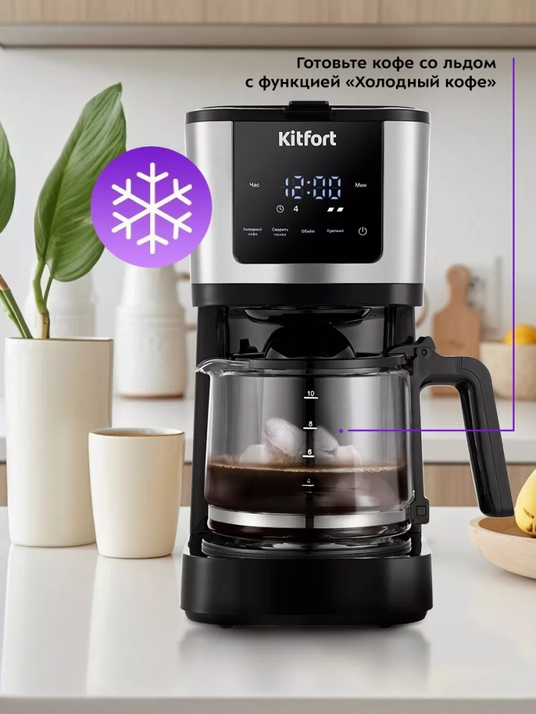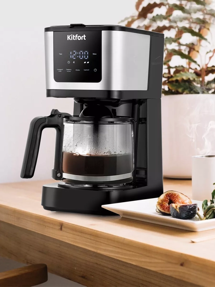 Капельная кофеварка Kitfort КТ-7217 готовит ароматный черный кофе из молотого кофе.