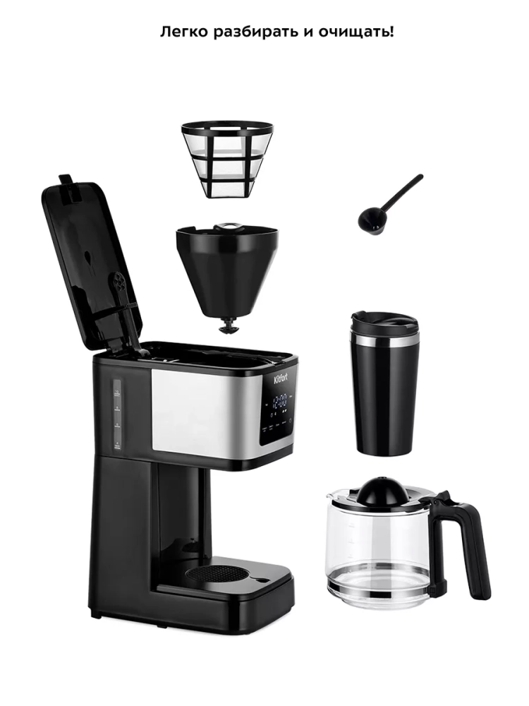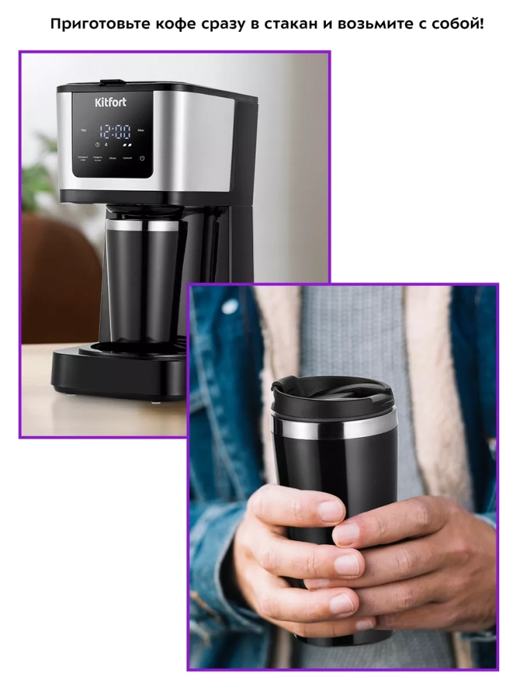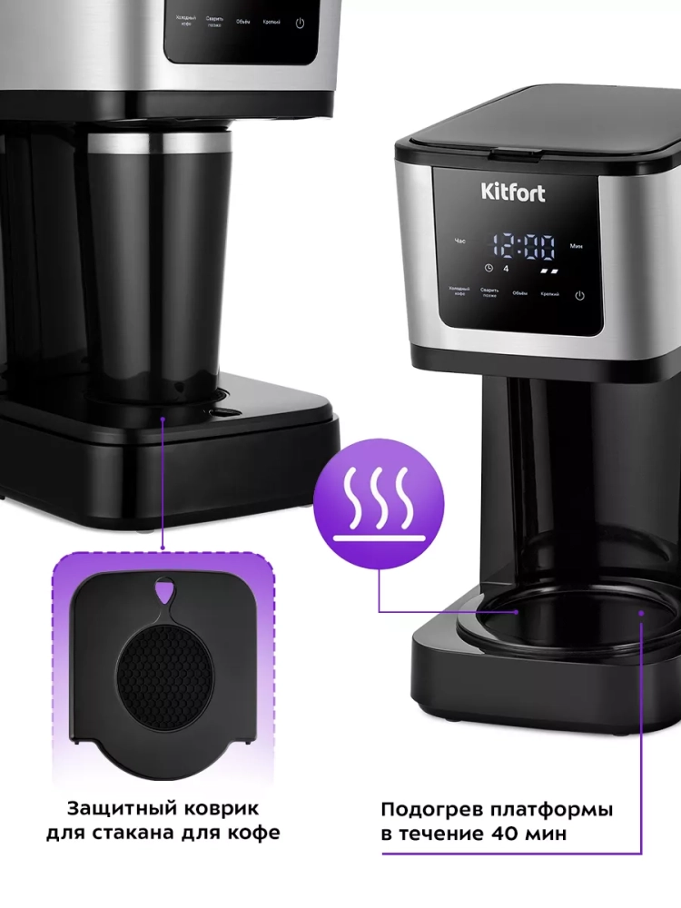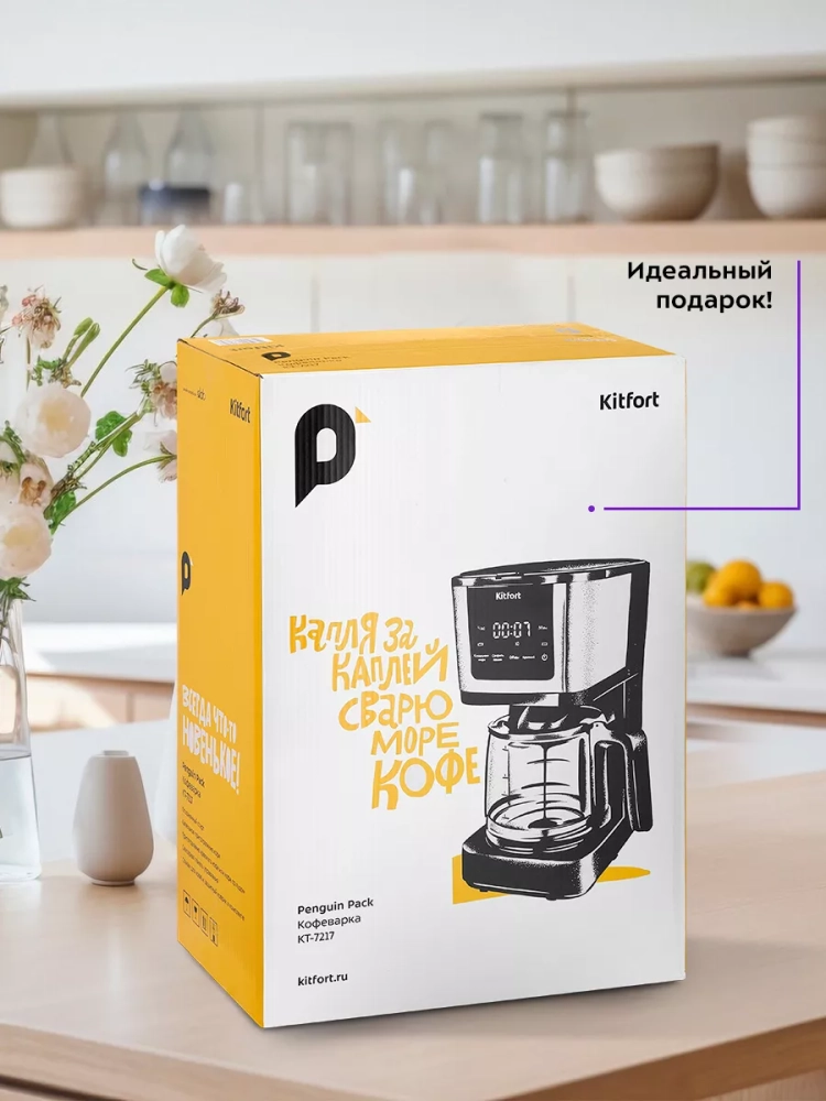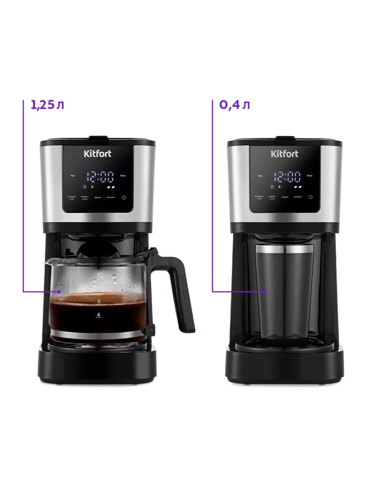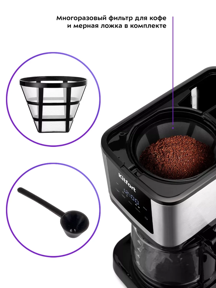 Капельная кофеварка Kitfort КТ-7217 готовит ароматный черный кофе из молотого кофе.