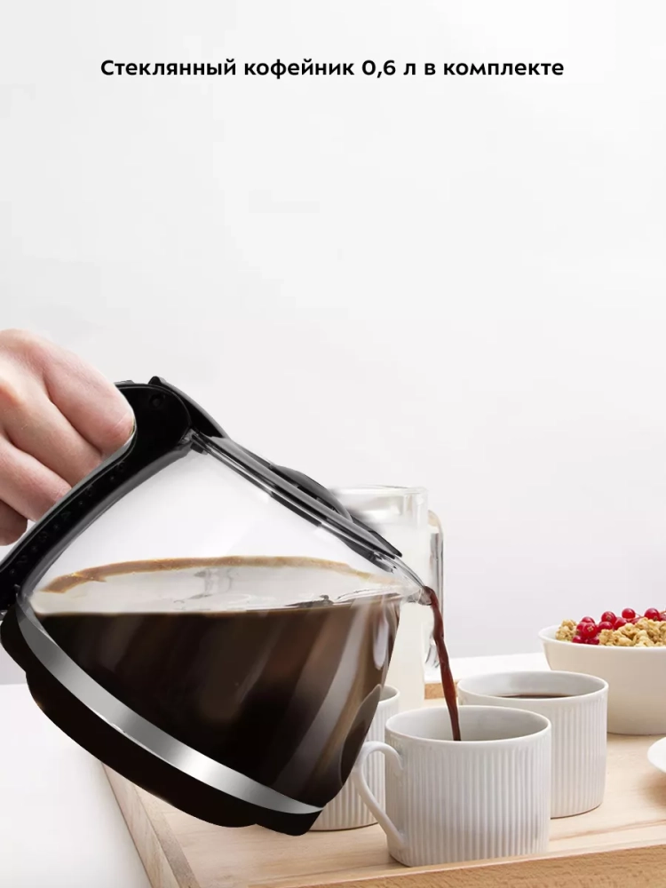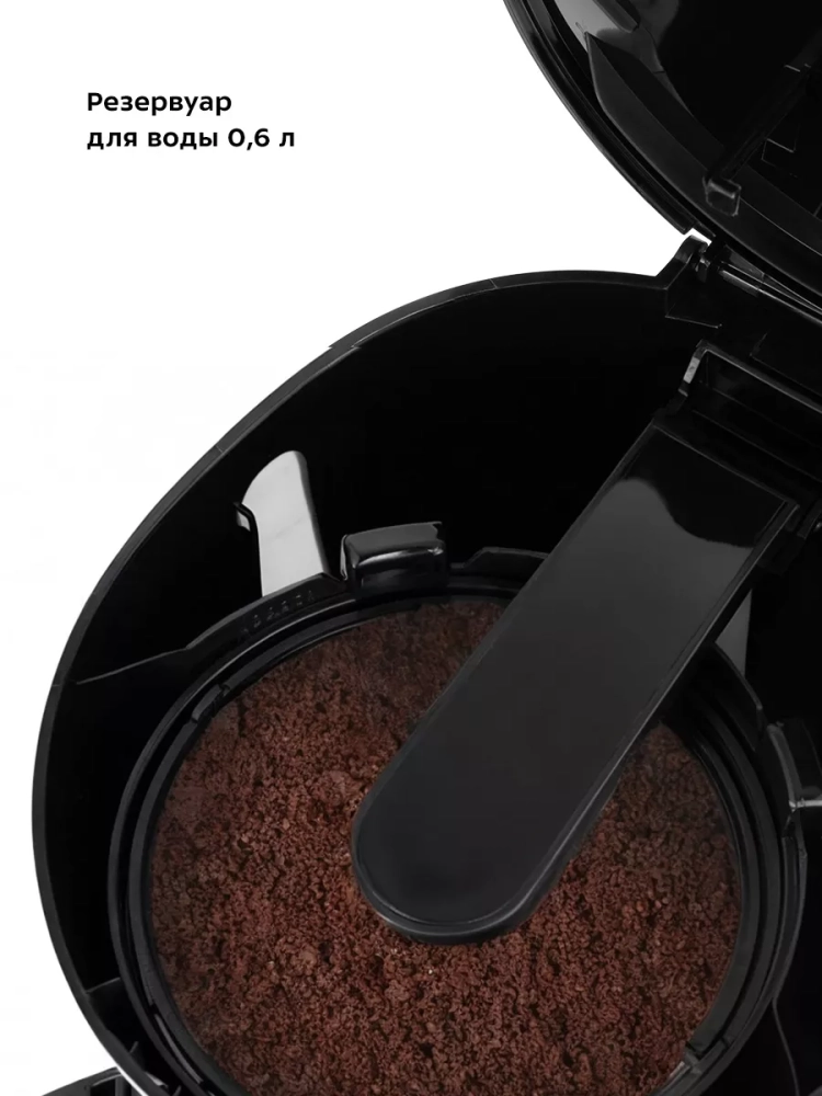 Резервуар для воды емкостью 0,6 л позволяет за один раз приготовить кофе на 6 чашек (по 100 мл). На резервуаре для воды и на кофейнике нанесены соответствующие отметки, поэтому вам будет удобно приготовить нужное количество чашек кофе. Кофейник стеклянный, поэтому вы всегда можете видеть, сколько кофе осталось.