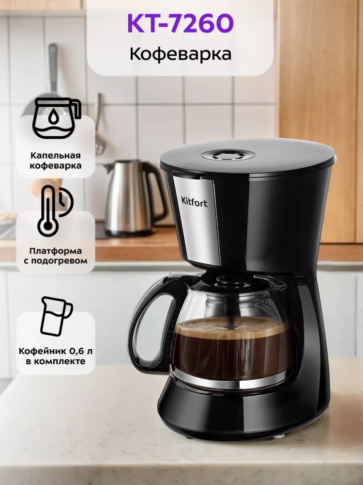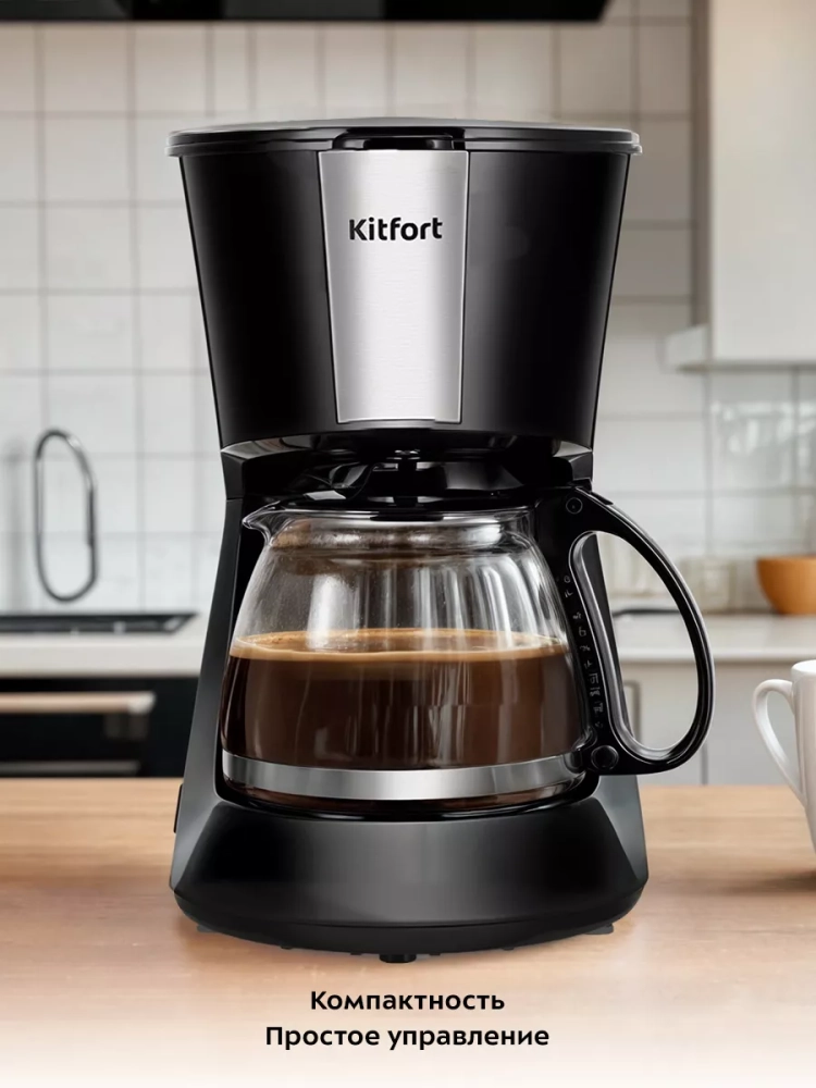 Капельная кофеварка Kitfort КТ-7260 готовит ароматный черный кофе из молотого кофе.